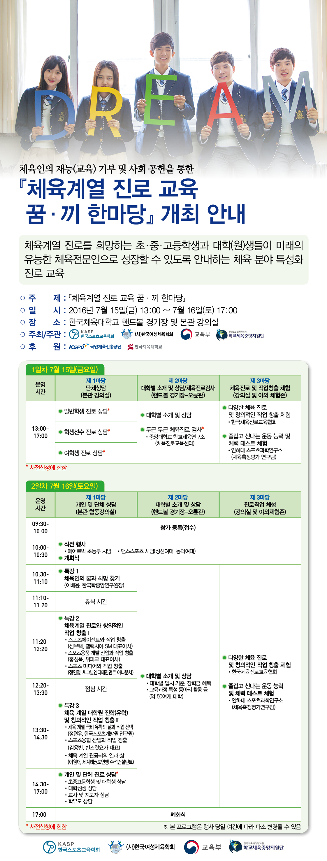체육계열 진로를 희망하는 초??고등학생과 대학()생들이 미래의 유능한 체육전문인으로 성장할 수 있도록 안내하는 체육 분야 특성화 진로?직업 교육을 목적으로체육계열 진로 교육 꿈?끼 한마당  한국체육대학교에서 개최합니다.