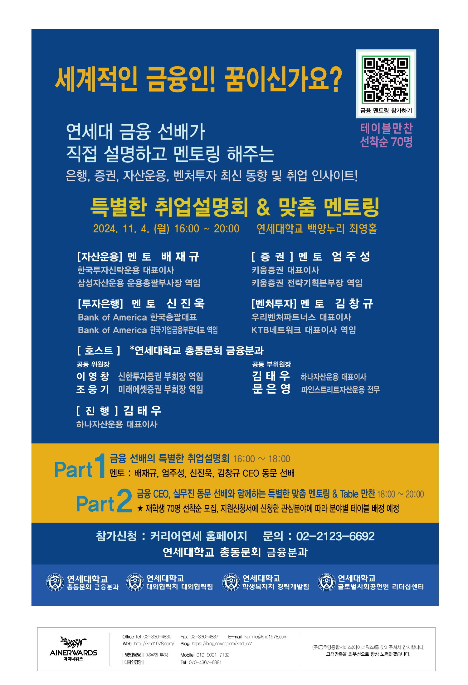 [홍보] 총동문회 금융멘토링 취업설명회(11월 4일, 16:00~20:00, 백양누리 최영홀)