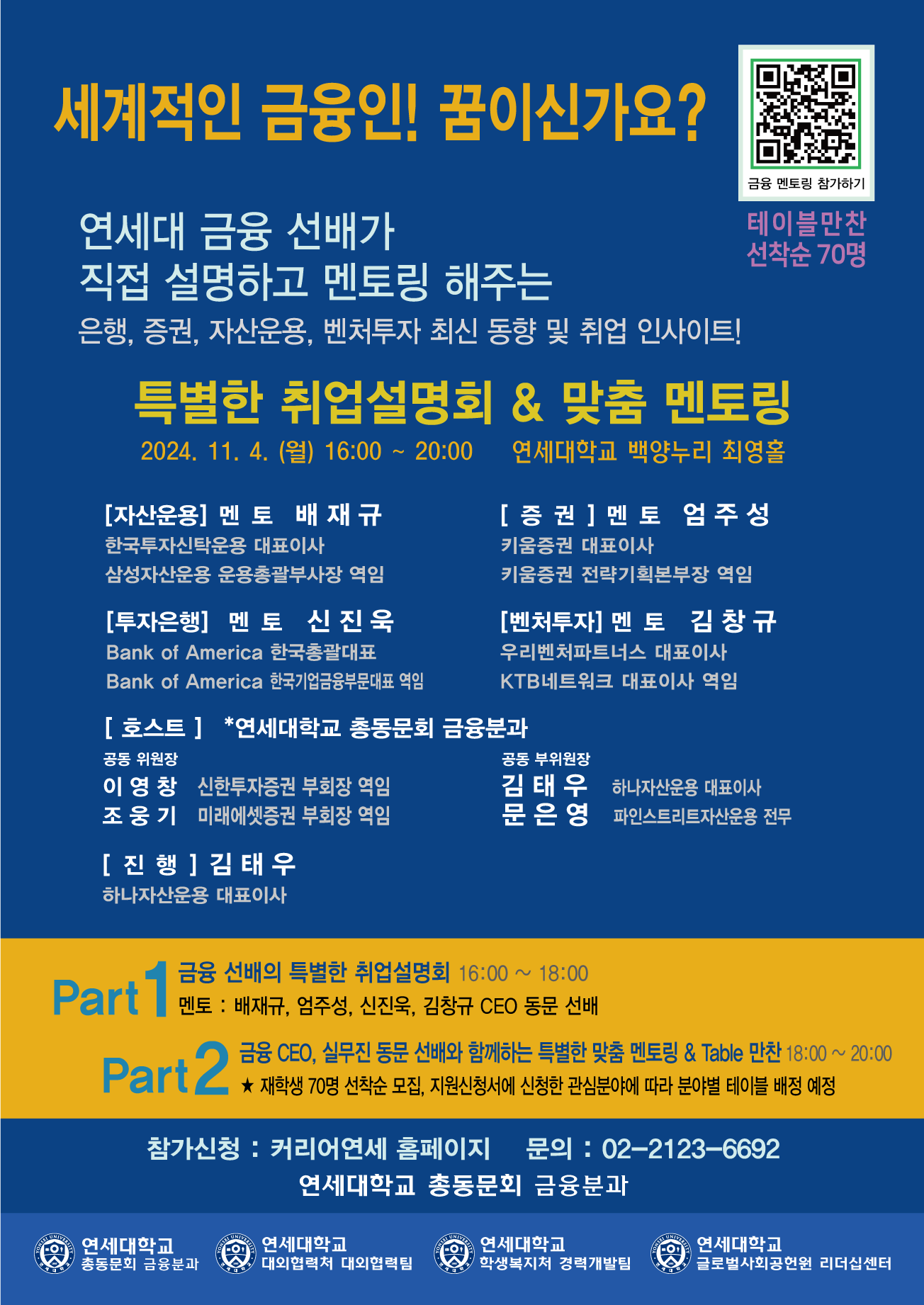 이번 총동문회 금융분과에서 11/4(월) 취업설명회 멘토링 행사를 준비하고 있습니다.