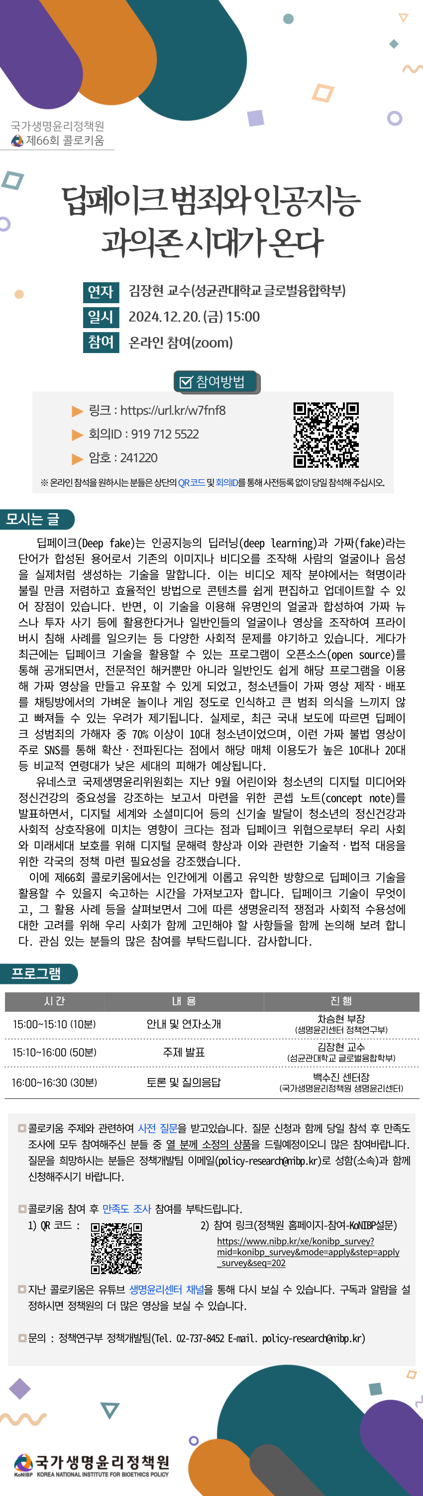 (24/12/20)​ [국가생명윤리정책원] 제66회 콜로키움 「딥페이크 범죄와 인공지능 과의존 시대가 온다」