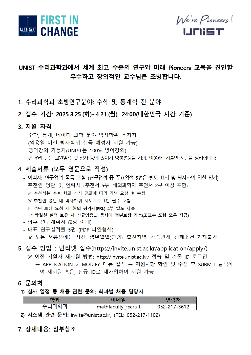 UNIST(울산과학기술원) 수리과학과에서 2025학년도 전임교원 초빙공고를 진행하고 있습니다.