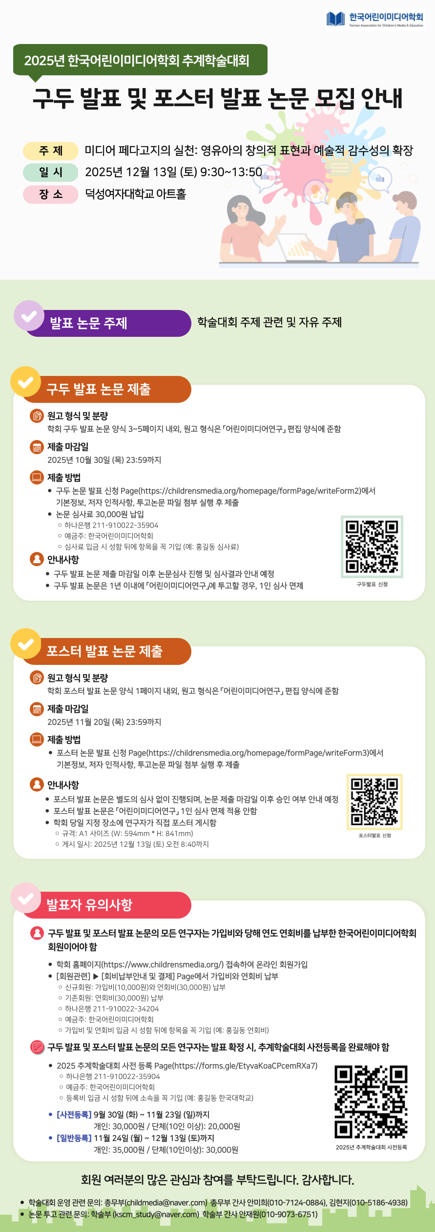 2025년 한국어린이미디어학회 추계학술대회 사전등록 및 구두/포스터 발표 논문 모집 안내
