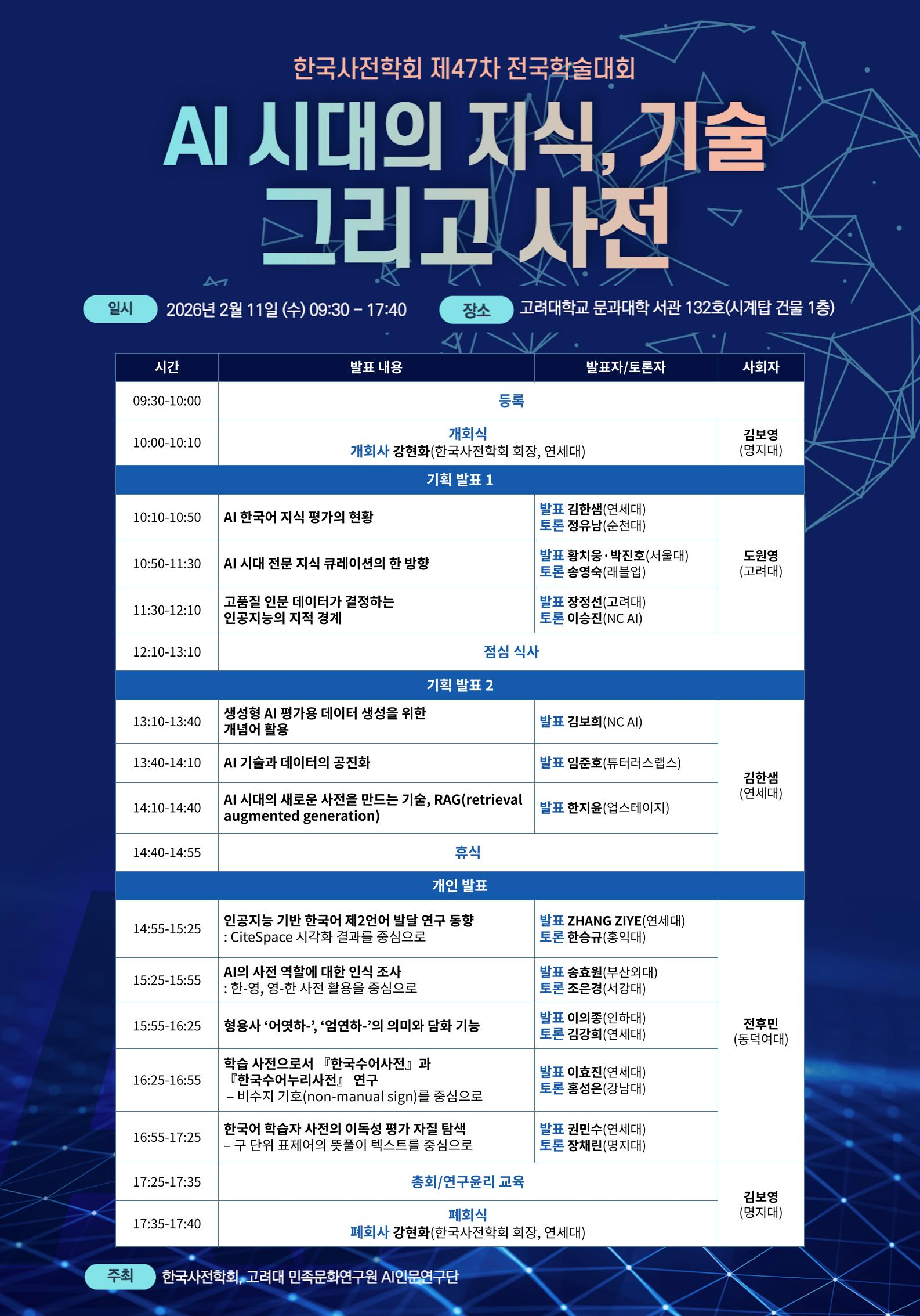 | 한국사전학회 제47차 전국학술대회 | 2월 11일(수), 고려대학교 문과대학 서관 132호 |