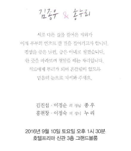 김진섭 전임 회장님의 장남 종우씨의 결혼식이 아래와 같이 있사오니