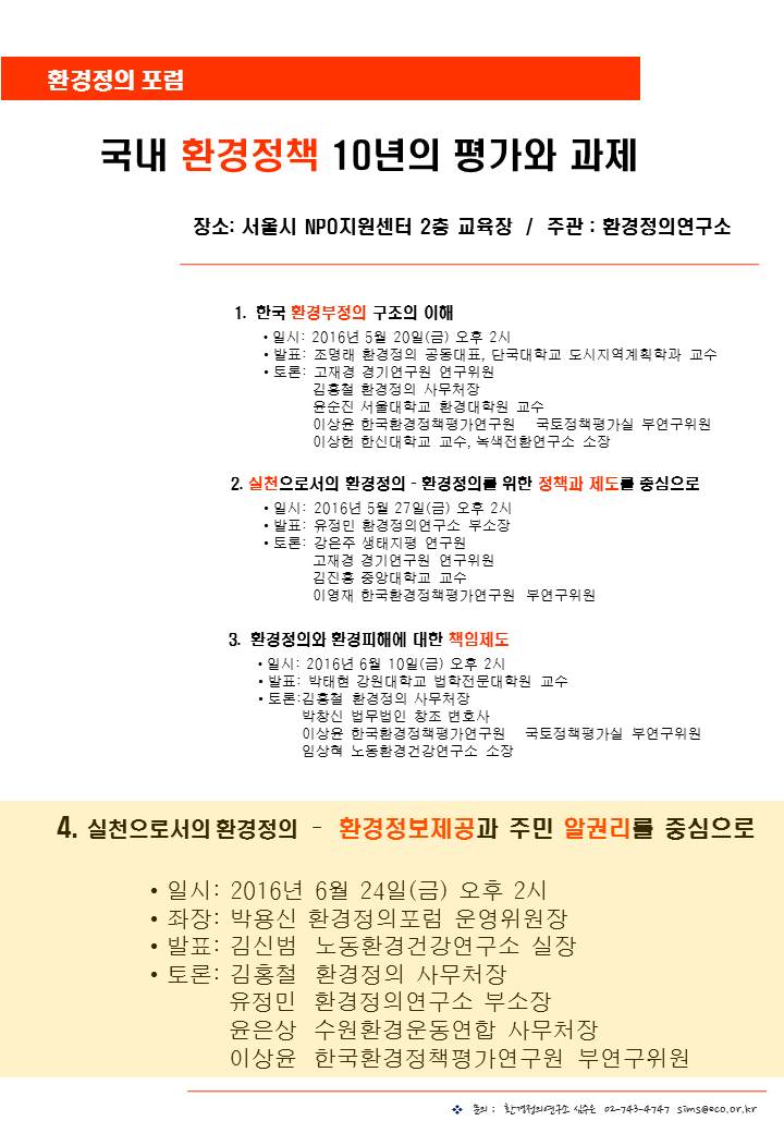 환경정의 시각으로 지난 10년 간의 국내 환경정책에 대해 평가하고 환경정의 실현을 위한 정책과제를 제안하기 위한 연속 포럼이 진행되고 있습니다.