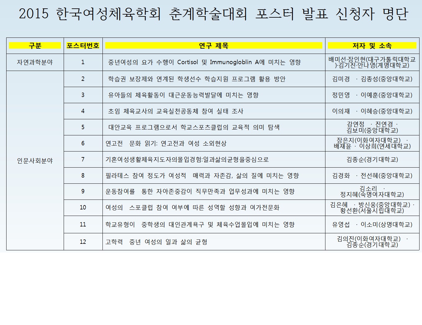 2015 춘계학술대회 포스터 발표자 접수가 마감되었습니다.