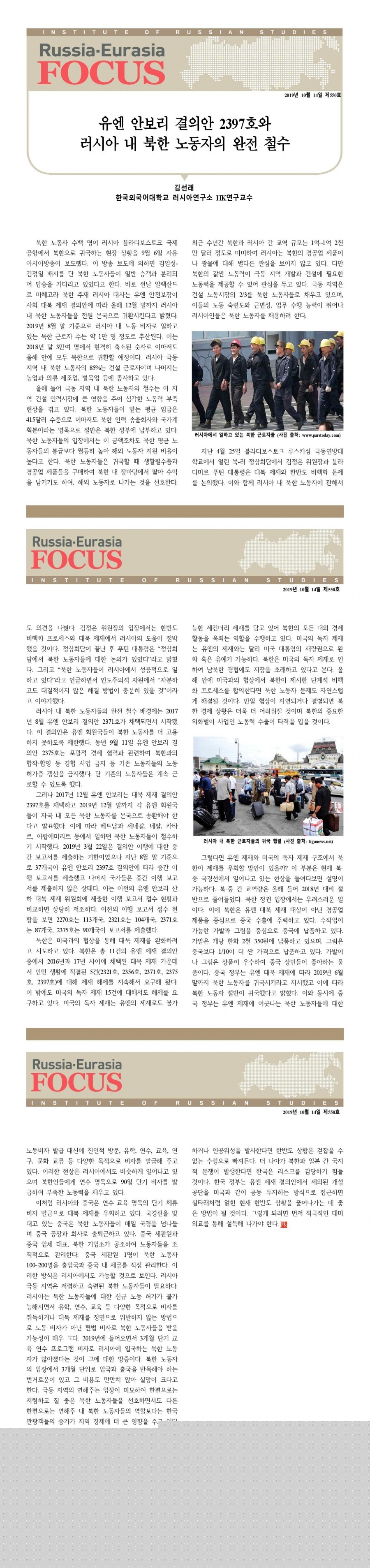 제550호 유엔 안보리 결의안 2397호와 러시아 내 북한 노동자의 완전 철수
