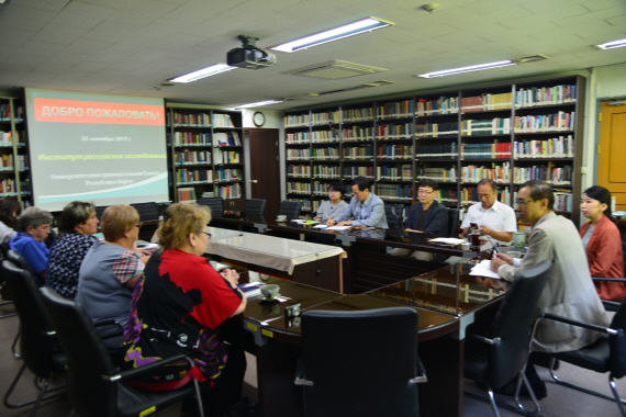 2017 년  9 월  15 ( 극동 지역 학자들이 본 연구소를 방문했다 러시아연구소를 찾은 학자는 옥사나 페디르코 극동역사고고학민족학연구소 선임연구원 스베틀라나 두다료녹 극동연방대 역사고고학과 교수 알렉산드라 포스펠로바 북동국립대 ( 마가단 교수 레프 심킨 법학박사 겸 모스크바 명예변호사로 본 연구소와의 학술협력에 대해 깊은 관심을 표했다 러시아연구소 측에서는 강덕수 소장 이하 김선래  HK 연구교수 김혜진  HK 연구교수 이재훈 토대연구팀 전임연구원 신동혁 토대연구팀 전임연구원이 참석했다