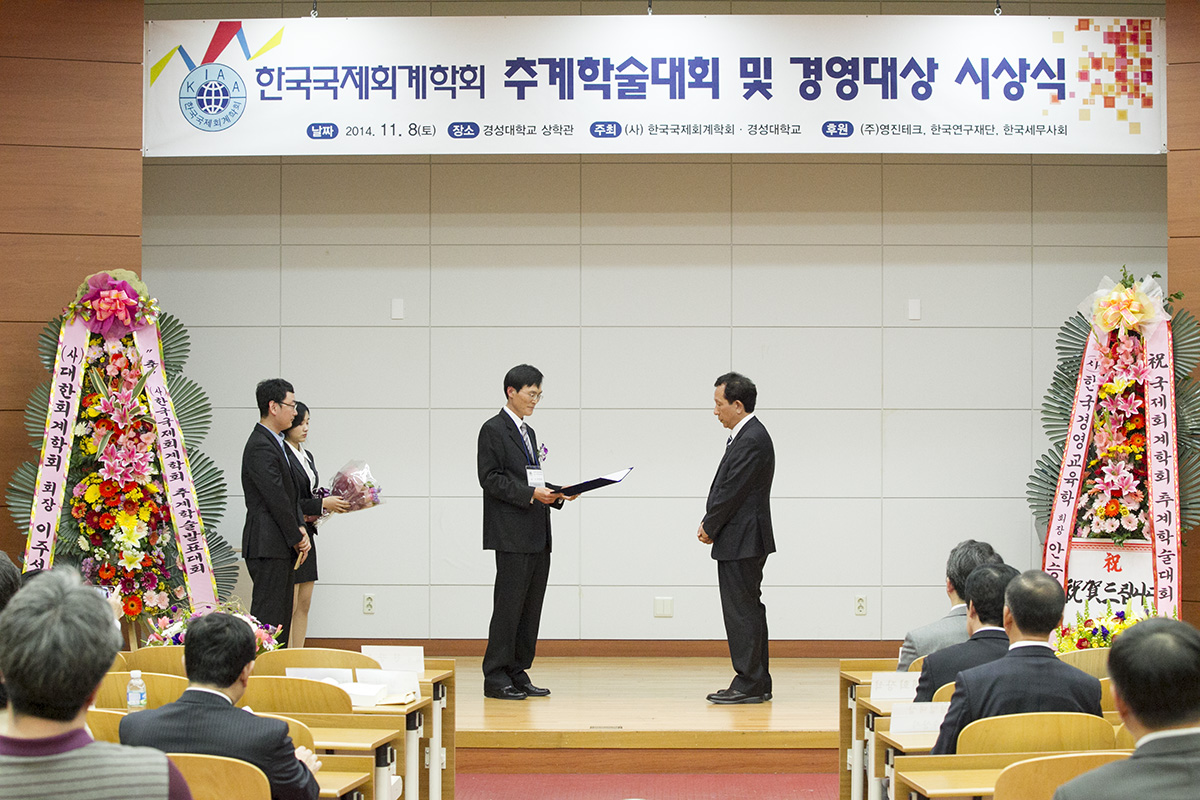 안녕하십니까? 지난 11월 8일(토) 경성대학교에서 열린 2014년 한국국제회계학회 추계학술대회 및 경영대상 시상식이 성황리에 개최되었습니다. 이번 학회는 170명이 넘는 회원님들이 참석하셔서 45의 논문을 발표해 주셨습니다. 바쁘신 와중에도 먼 길을 마다하지 않으시고 참석해 주신 회원분들과 멀리서 관심 가져주신 모든 분들께 감사드립니다. 앞으로도 학회발전을 위해 많은 관심 부탁드립니다.