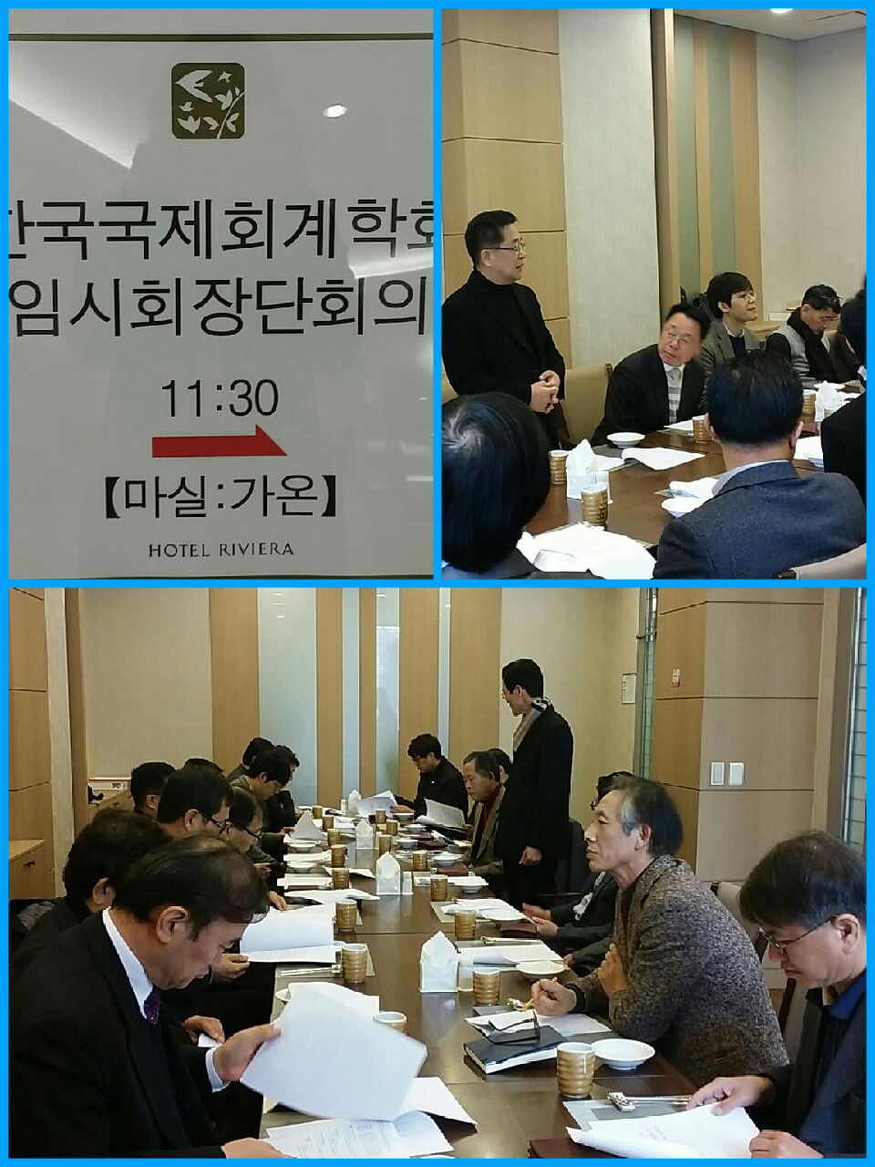 2014년 1월 16일(목)에 대전 호텔리베라에서 28분이 참석하신 가운데 임원회의가 열렸습니다. 바쁘신 와중에도 참석해주신 많은 임원님들께 감사드립니다. 특히 회의에서 제안해 주신 좋은 의견들은 학회 운영에 꼭 반영될 수 있도록 노력하겠습니다. 끝으로 2013년 한 해동안 학회 발전을 위해 애쓰신 제14대 한국국제회계학회 회장님과 사무국, 편집위원회에 진심으로 감사드립니다.