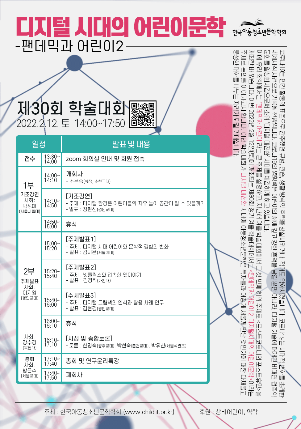 이번 학술대회는 “팬데믹과 어린이 2 - 디지털 시대의 어린이문학”이라는 주제로