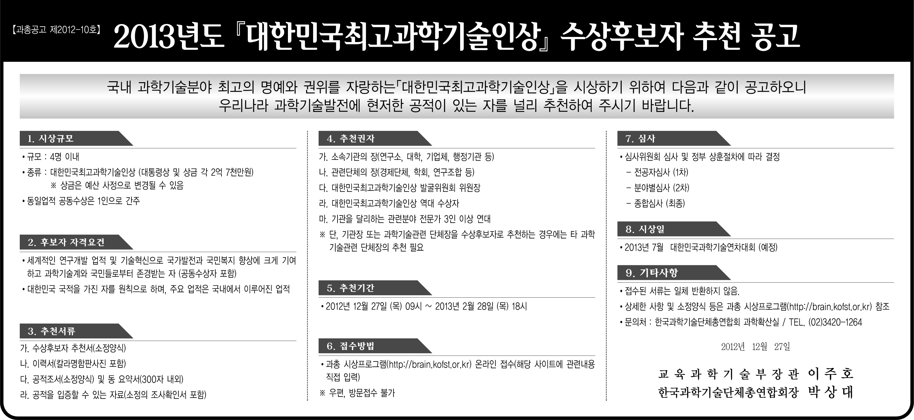 2. 2013년도『대한민국최고과학기술인상』수상후보자 추천공고 1부. 끝.