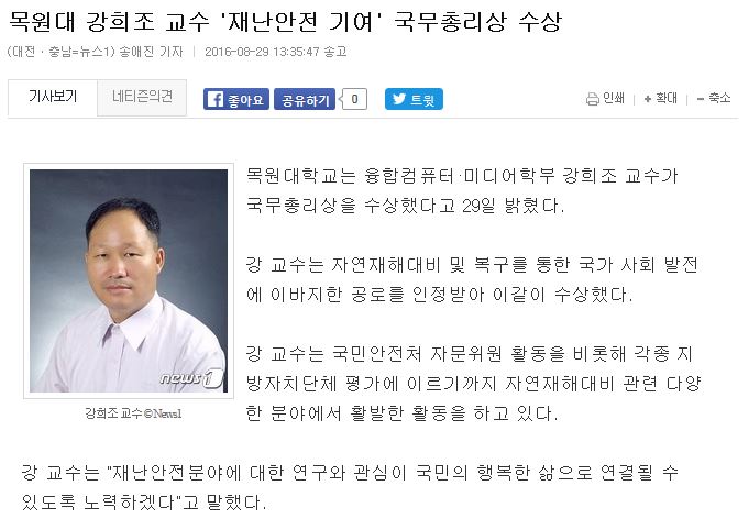 우리학회 수석부회장이신 강희조 목원대 교수님께서 자연재해대비 및 복구를 통한 국가 사회 발전에 이바지한 공로를 인정받아 지난 8월 29일 국무총리상을 수상하셨습니다.