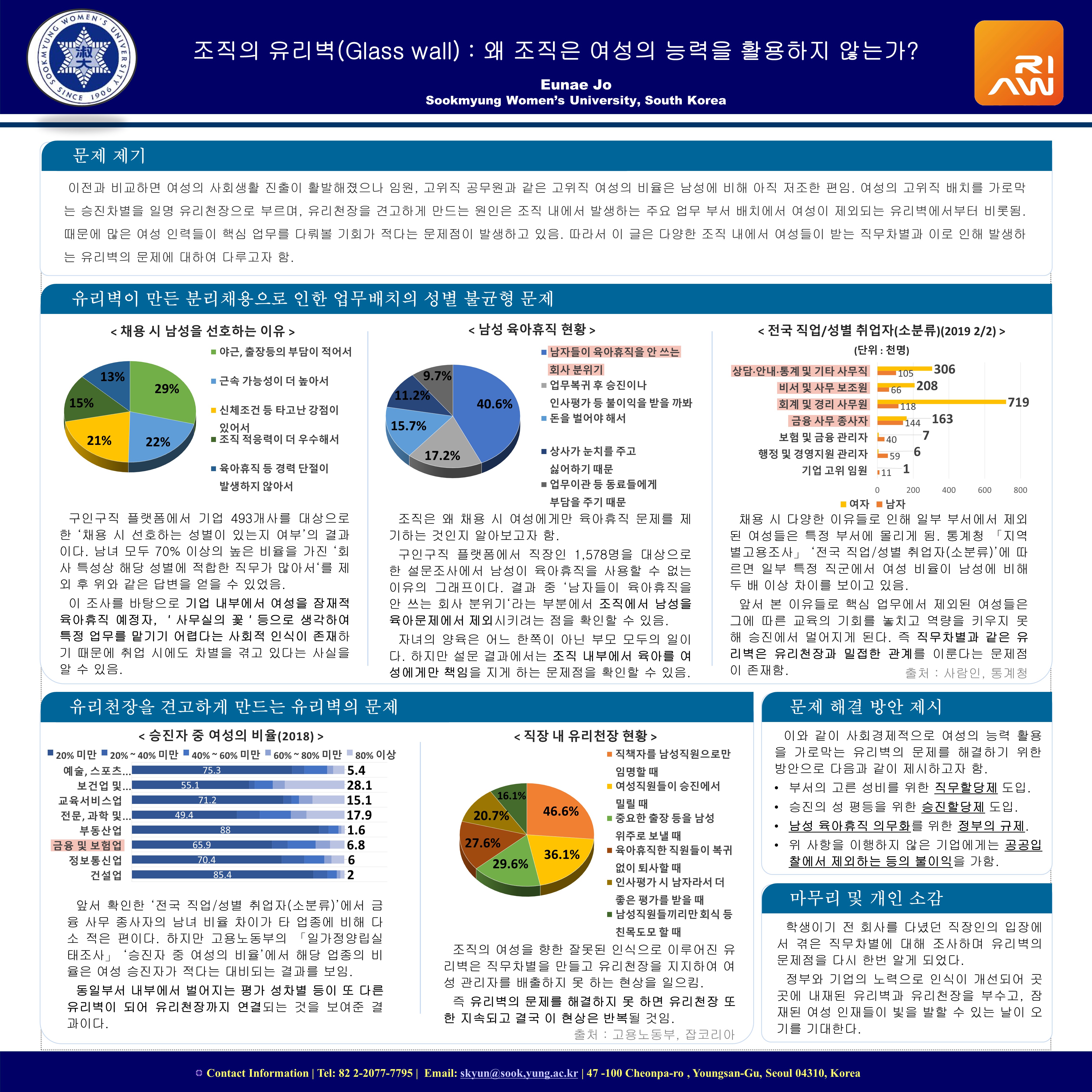 • 유리벽의 문제를 해결하기 위해, 직무할당제, 승진할당제, 남성 육아휴직의 의무화를 제시하고 이를 이행하기 않은 기업에 대해  정부의 규제 및 공공입찰에서 제외하는 불이익을 징수 방안을 제시한다.