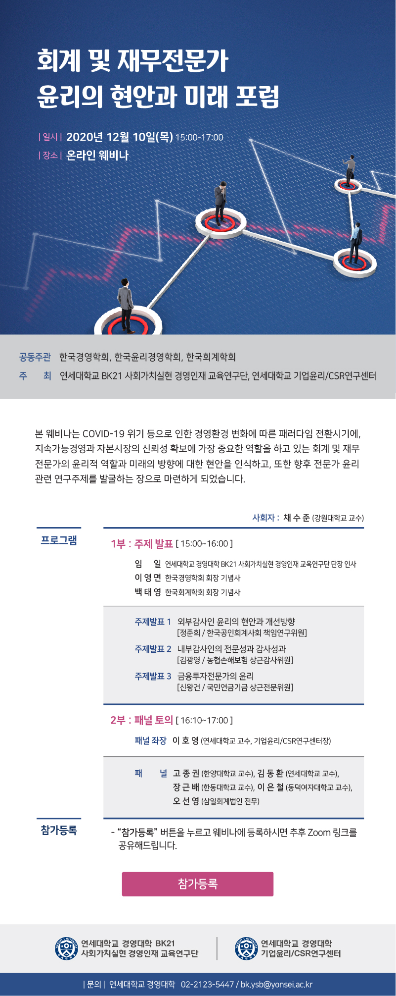 [한국경영학회] 회계 및 재무전문가 윤리의 현안과 미래 포럼 안내 (12/10 온라인 개최)