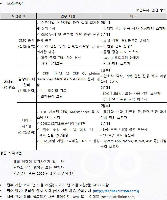 셀트리온 데이터사이언스연구소에서는 의약품 임상 데이터 관리 업무 및 임상/CMC통계분석 업무를 함께할 인재들을 모집하고 있으니 많은 관심 바랍니다.