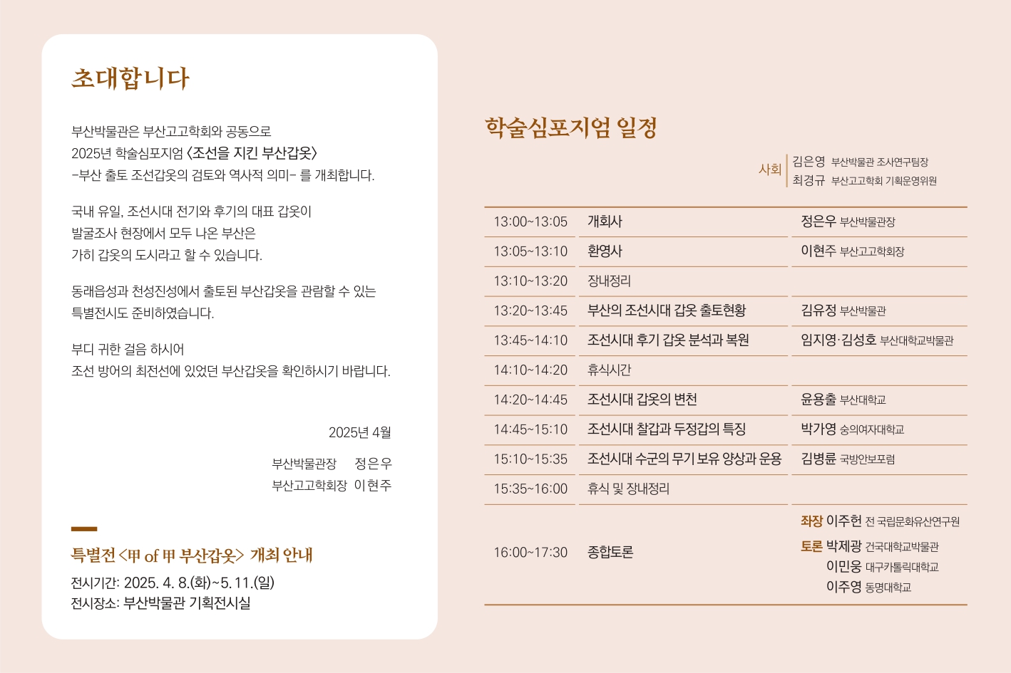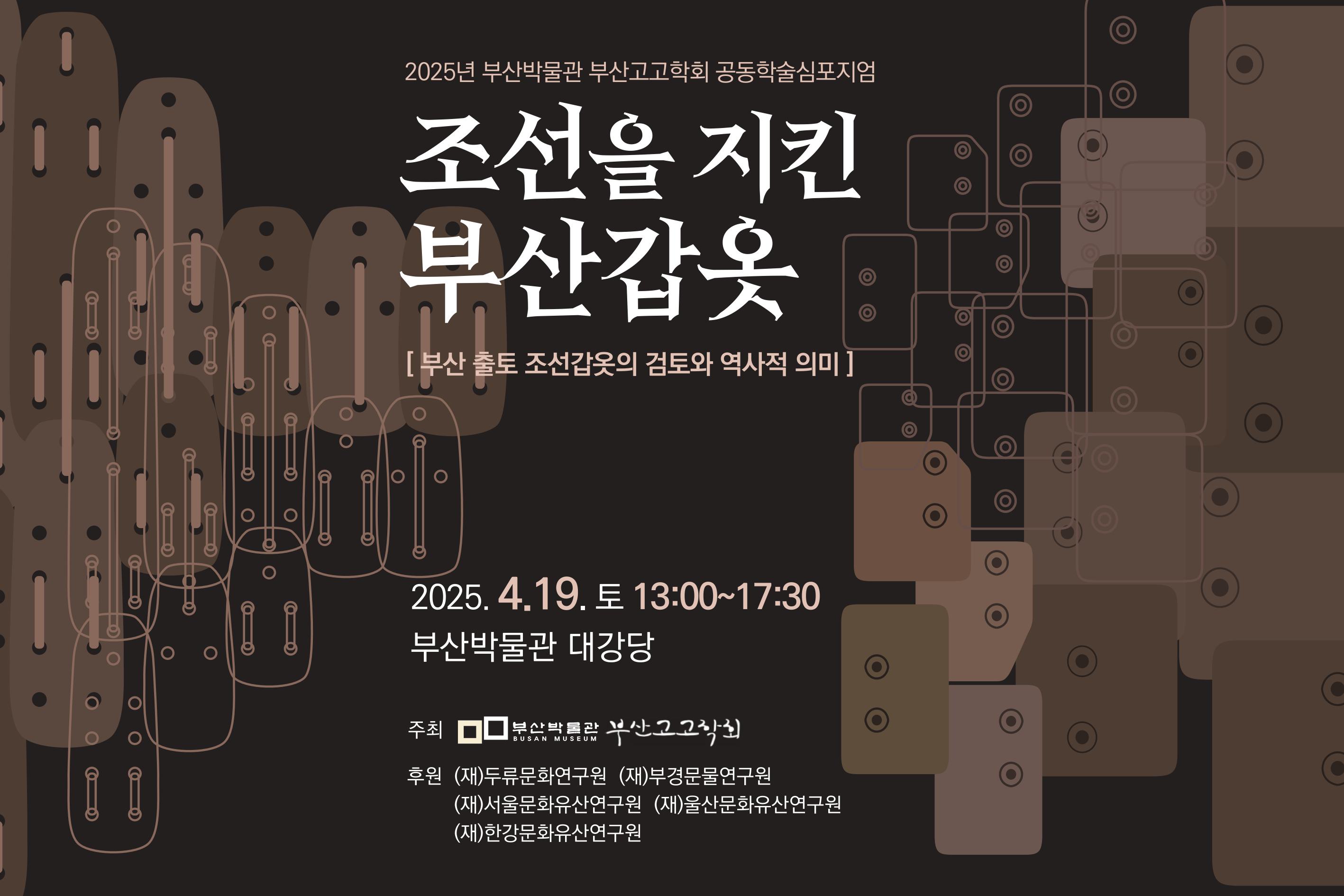 2025년 4월 19일(토), 부산고고학회는 <조선을 지킨 부산갑옷 | 부산 출토 조선갑옷의 검토와 역사적 의미>를 주제로 부산박물관과 함께 공동학술심포지엄을 개최합니다.