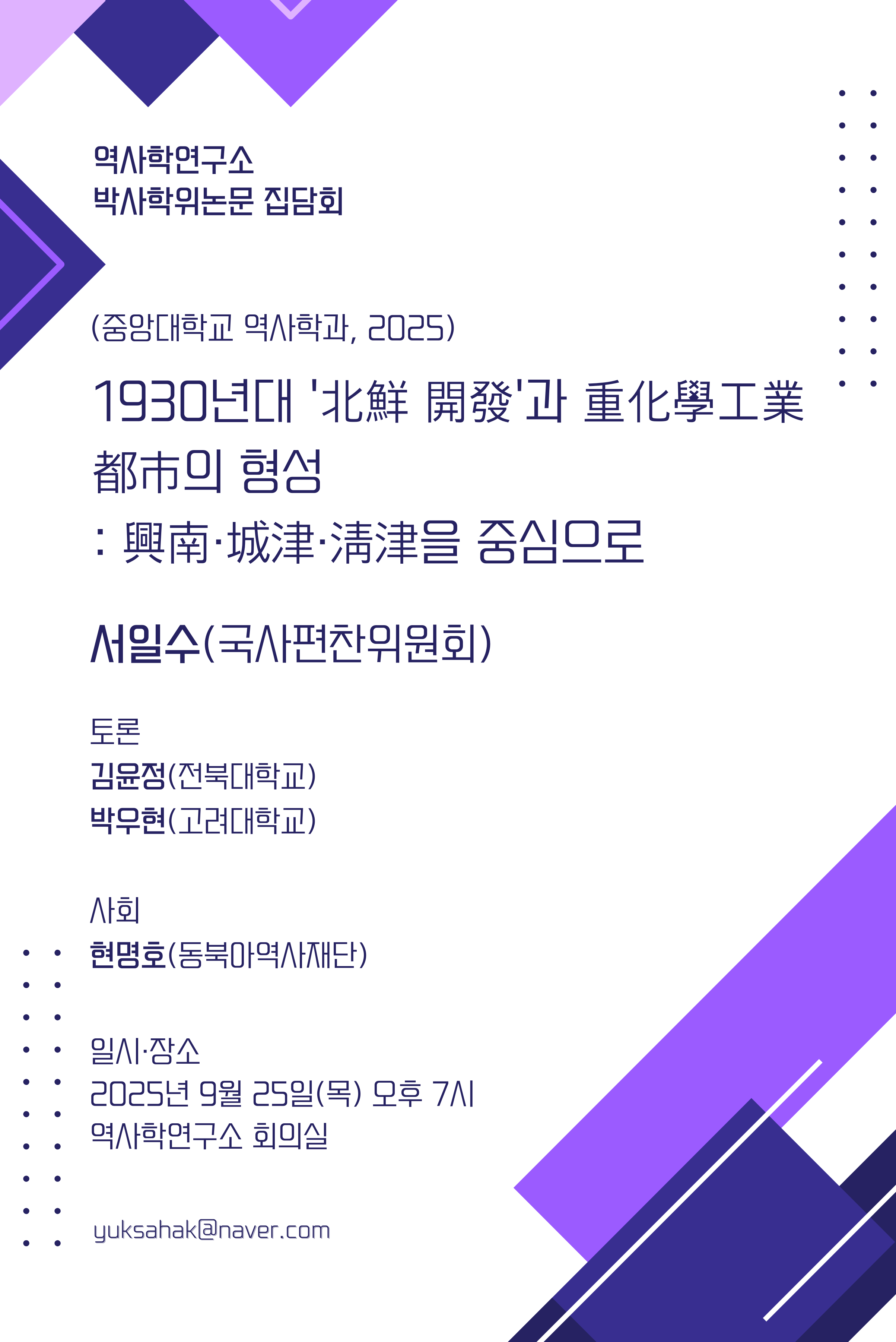 국사편찬위원회 서일수 선생님이 박사논문 <<1930년대 '北鮮 開發'과 重化學工業都市의 형성 : 興南·城津·淸津을 중심으로>> (2025) 을 주제로 발제하시고, 김윤정(전북대) 선생님과 박우현(고려대) 선생님께서 토론해 주십니다.