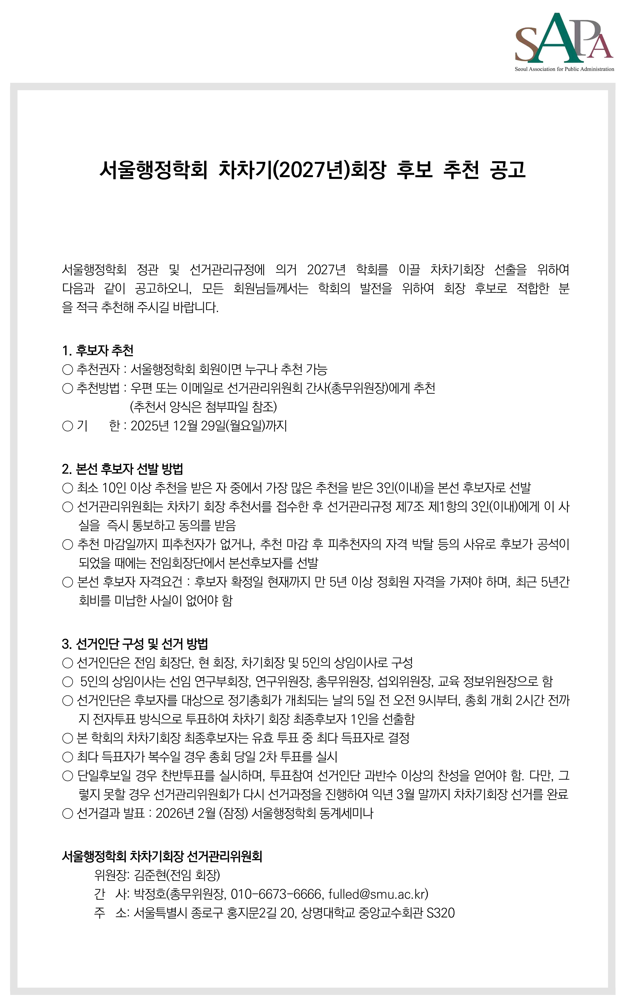 서울행정학회 차차기(2027년) 회장 후보 추천 공고