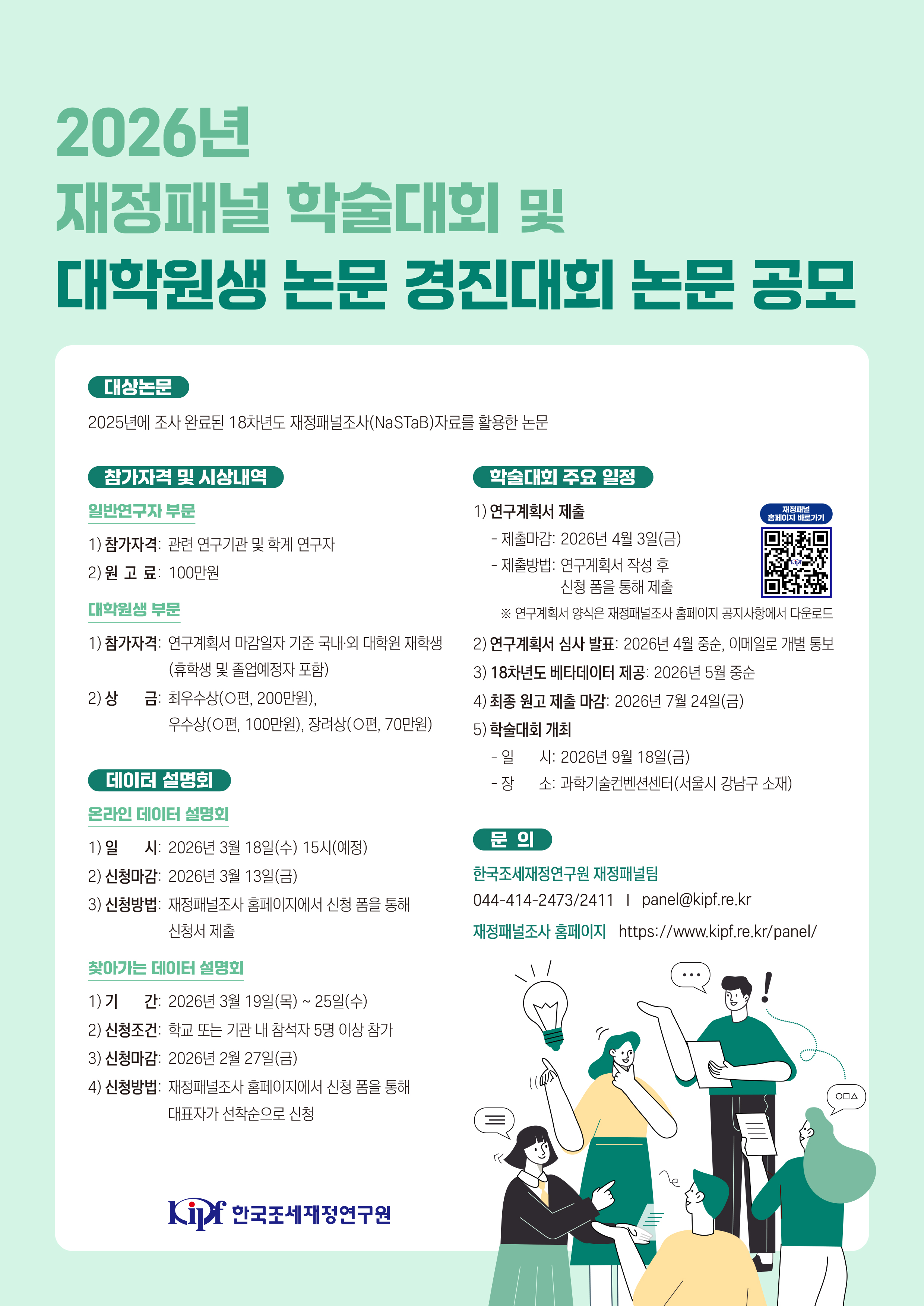 한국조세재정연구원에서는 ‘2026년 재정패널 학술대회 및 대학원생 논문 경진대회를 개최하고자 우수한 연구논문을 아래와 같이 모집합니다. 관심 있는 연구자 여러분들의 많은 참여 바랍니다.