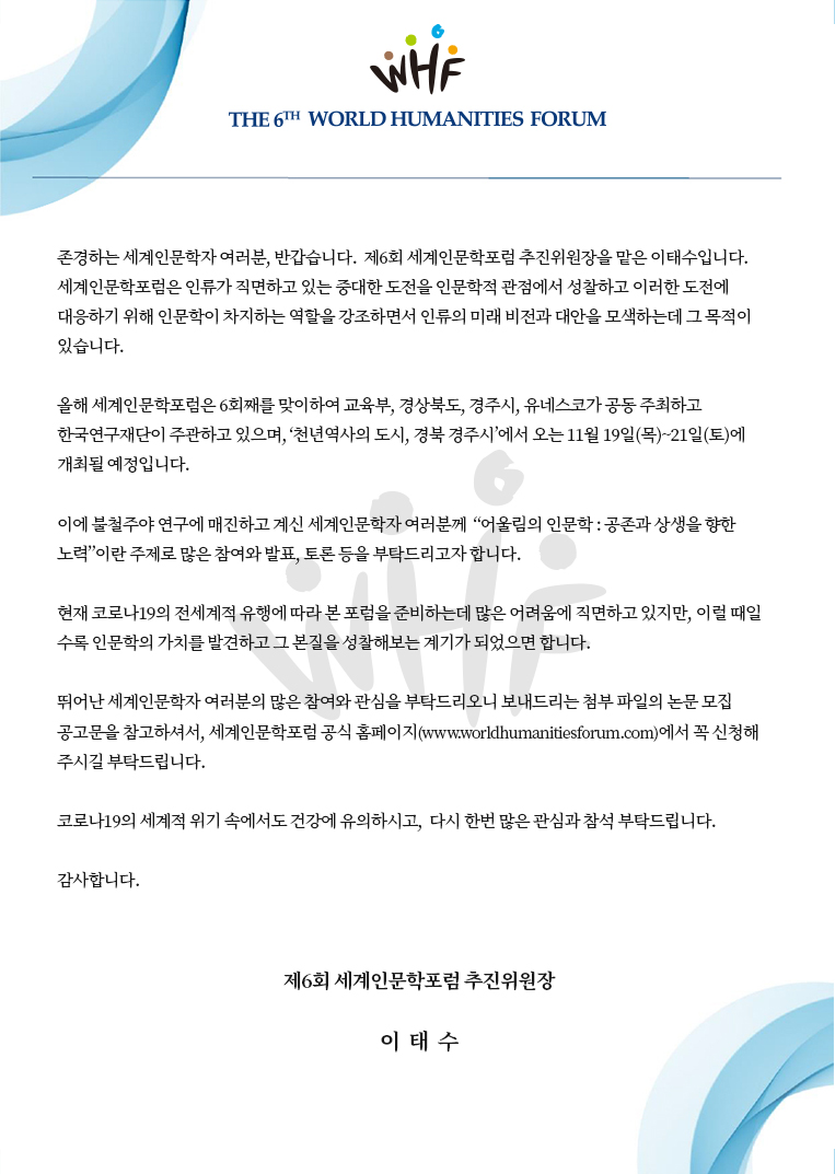 제6회 세계인문학포럼(WHF) 논문 모집 공고 (공고 기간 연장 : ~6/30)