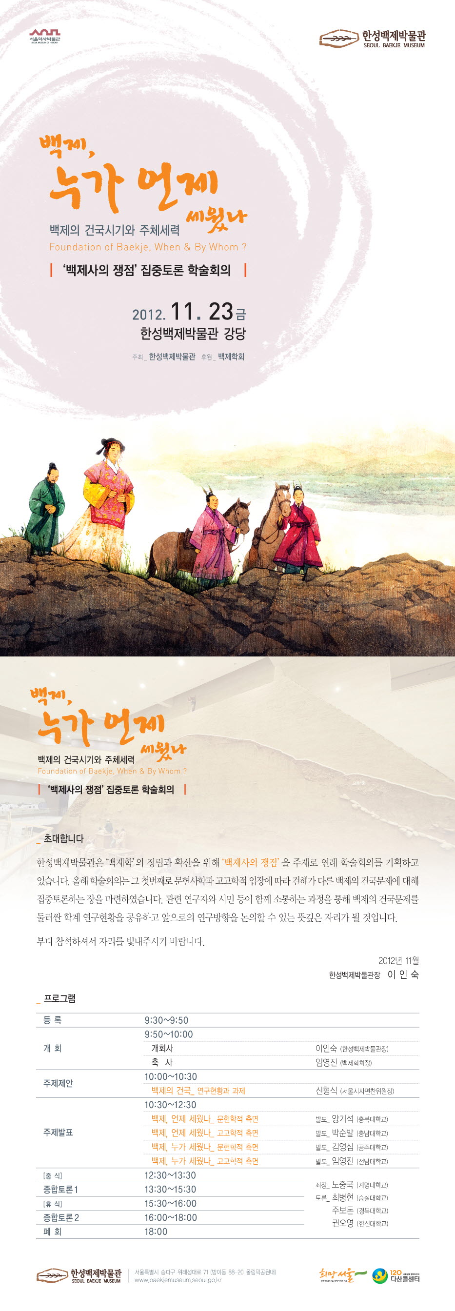 한성백제박물관은 '백제학'의 정립과 확산을 위해 '백제사의 쟁점'을 주제로 연례 학술회의를 기획하고 있습니다. 올해 학술회의는 그 첫번째로 문헌사학과 고고학적 입장에따라 견해가 다른 백제의 건국문제에 대해 집중토론하는 장을 마련하였습니다. 관련 연구자와 시민 등이 함께 소통하는 과정을 통해 백제의 건국문제를 둘러싼 학계 연구현황을 공유하고 앞으로의 연구방향을 논의할 수 있는 뜻깊은 자리가 될 것입니다.