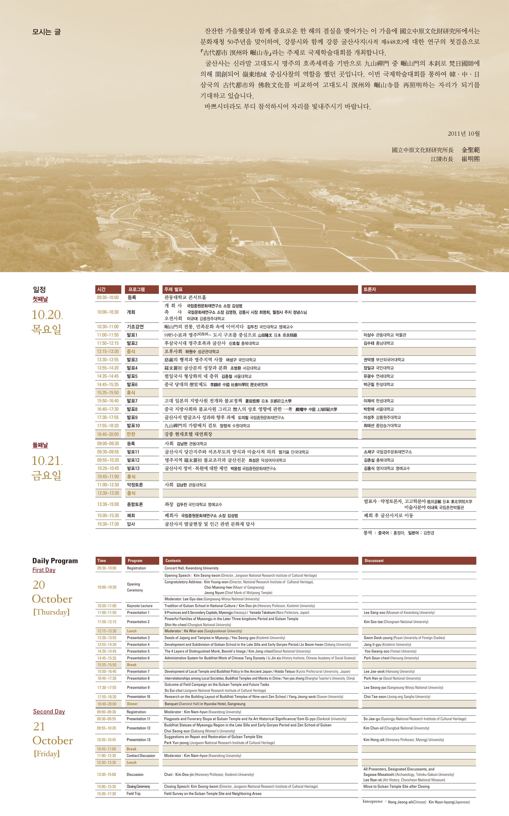 국립중원문화재연구소는 문화재청 보존정책과, 강릉시와 공동으로 영동지역 대표적인 국가 사적지이자 통일신라시대 구산선문(九山禪門) 중 하나이며, 유네스코 선정 세계 무형 문화유산 ‘강릉단오제’의 主神인 범일국사(梵日國師)가 개창한 굴산선문(?山禪門)의 중심 사찰 굴산사지(사적 제448호)를 중심으로 국제학술대회를 개최합니다.
