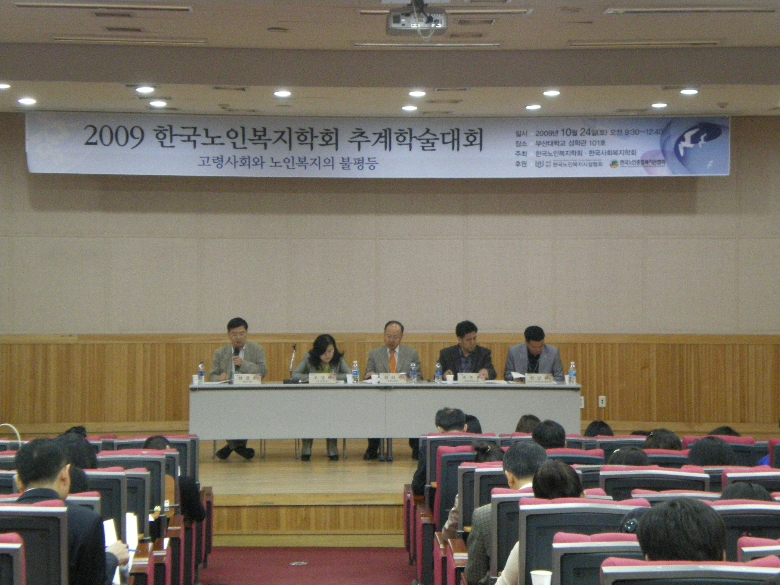 2009년 추계학술대회를 ‘고령사회와 노인복지의 불평등’이라는 주제를 가지고 부산대학교에서 200여명이 참석한 가운데 성공적으로 개최하였다. 성별간 노인복지의 불평등(석재은 교수, 한림대), 사회계층간 노인복지의 불평등(윤성호 교수, 동서대), 지역간 노인복지의 불평등(조성희 교수, 순천향대)에 대한 훌륭한 발표가 있었으며 주제별로 토론이 진행되었다. 발표와 토론 과정에서 학문적으로 크게 기여할 수 있는 연구의 방향성이 제시되었으며, 국가의 노인복지정책의 발전에 공헌할 수 있는 대책들이 논의되었다.