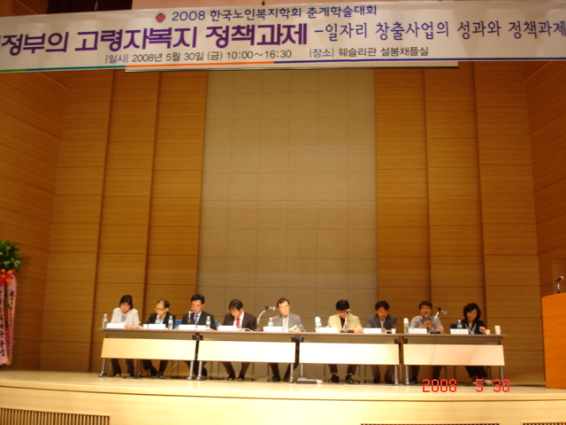 2008년 5월 30일(금) 협성대학교 웨슬리관 설봉채플에서 학회 회원 및 전문가등 500여명이 참석한 가운데 <새정부의 고령자 복지정책과제-일자리 창출사업 성과와 정책과제>란 주제로 2008년도 춘계학술대회가 개최되었다.