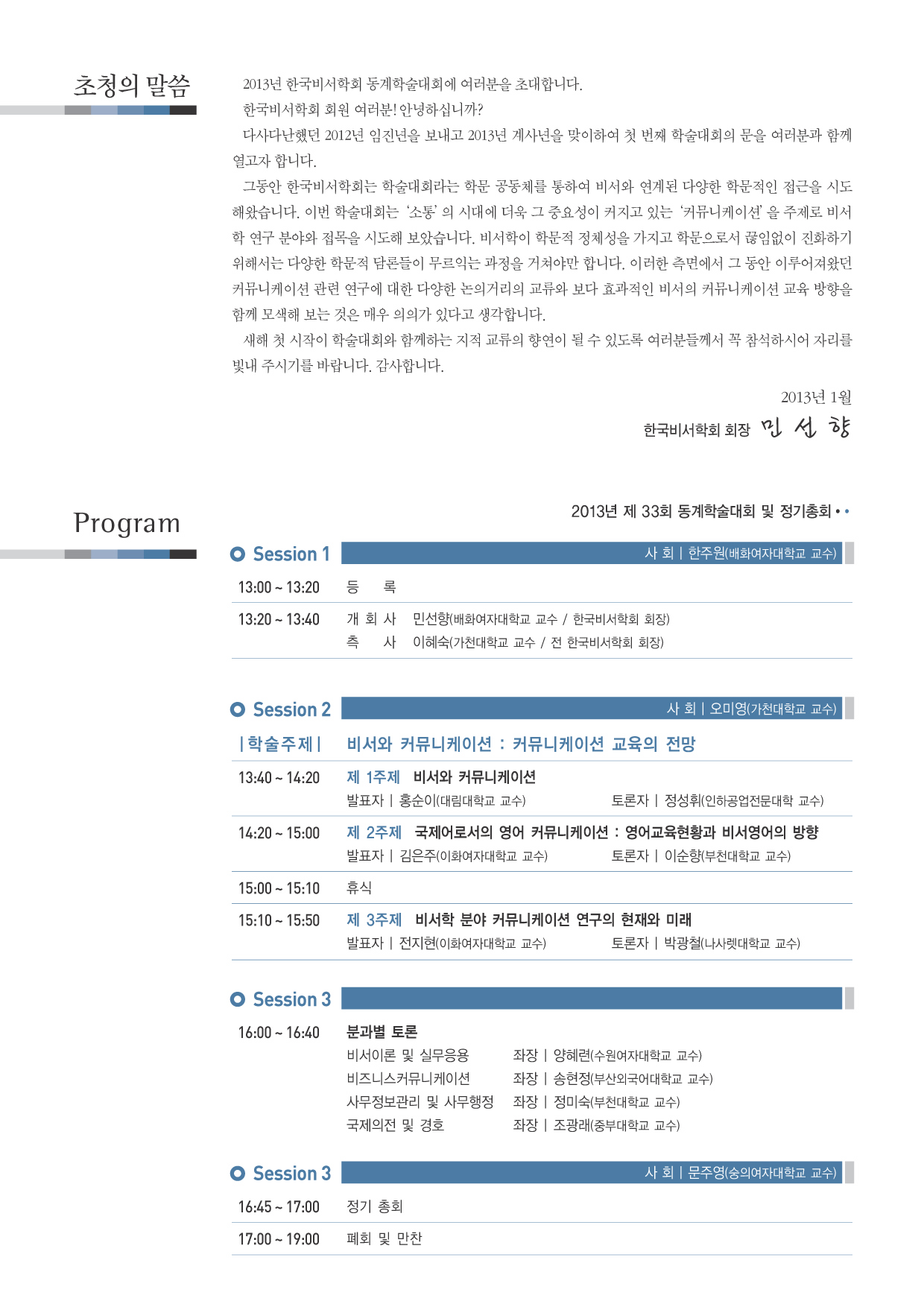 13:20 ~ 13:40     개회사 민선향 (배화여자대학교 교수 / 한국비서학회 회장)