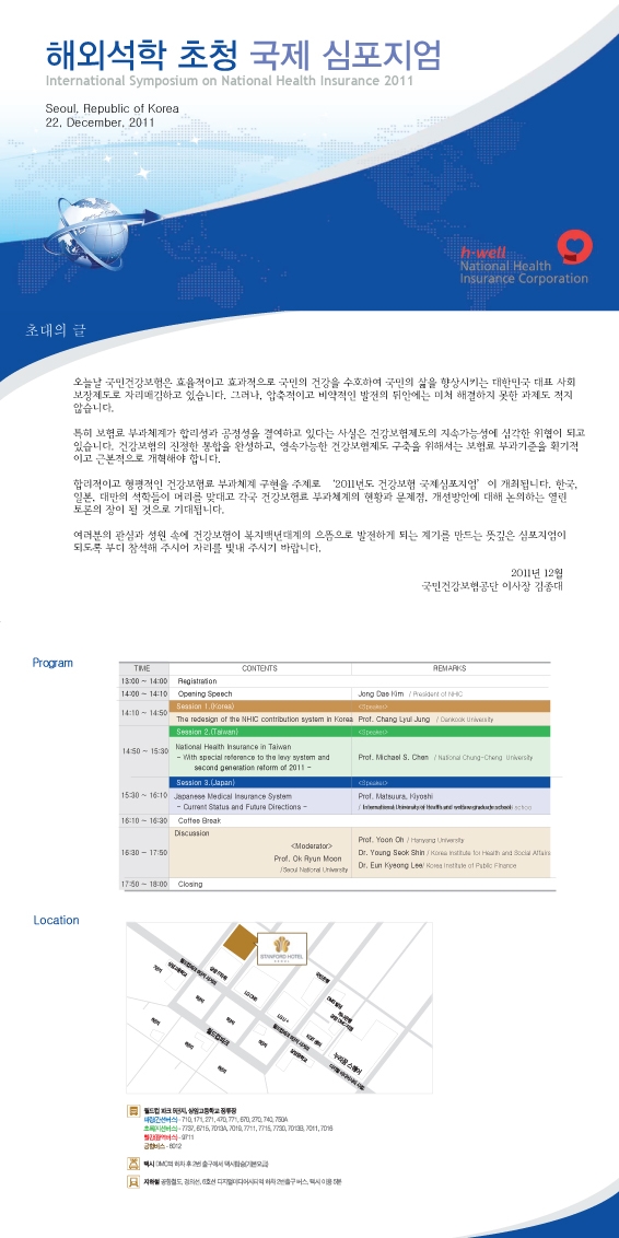국민건강보험공단은 한국, 대만, 일본의 건강보험료 부과체계의 현황, 문제점 및 개선방안을 논의하고 보험료 부담의 형평성 제고 및 영속 가능한 건강보험제도 구축에 기여하고자 아래와 같이 2011년도 국제심포지엄을 개최하고자 하오니 많은 참석 바랍니다.