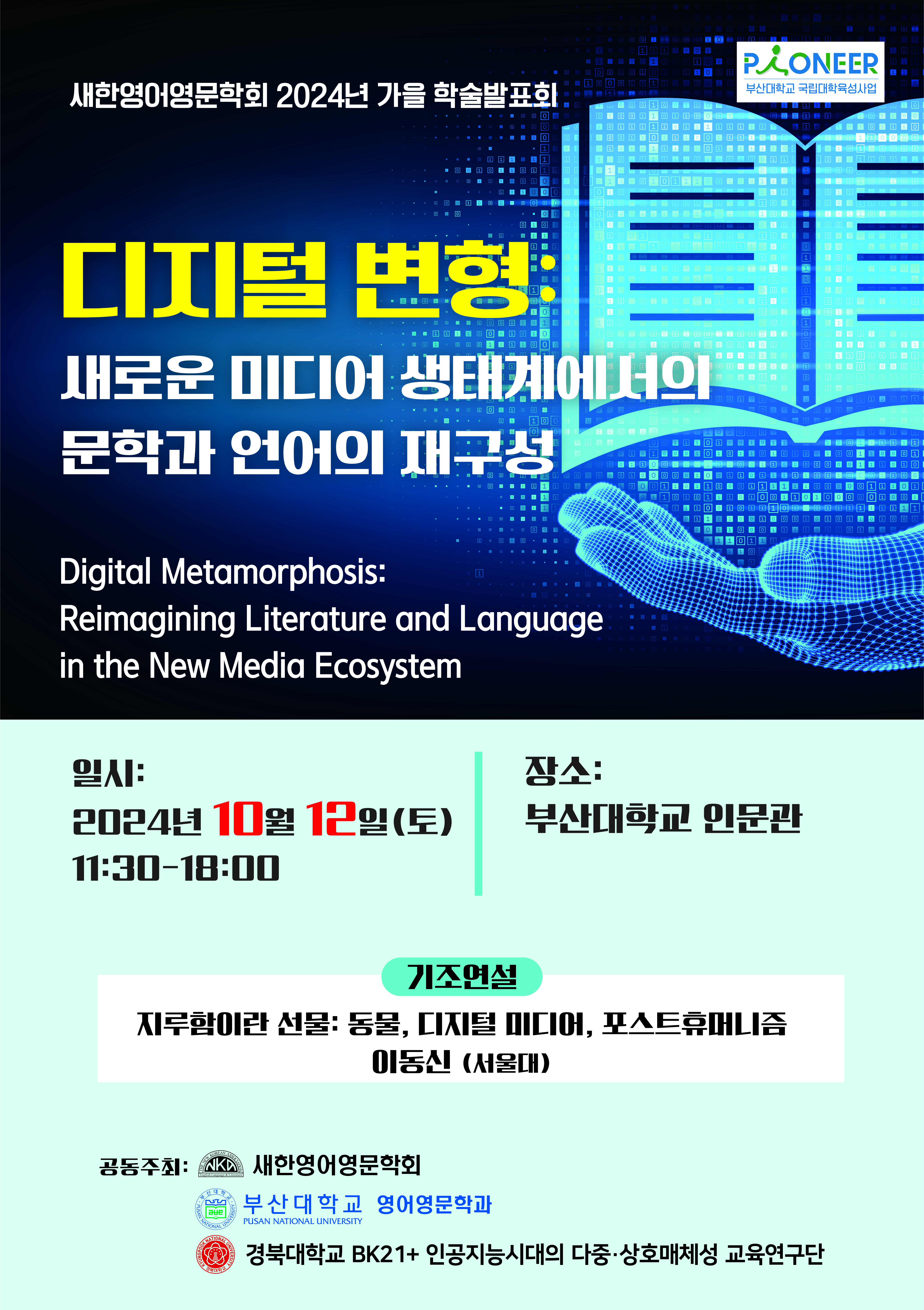 2024년 10월 12일 토요일 부산대학교에서 가을학술대회가 개최됩니다.  이번 가을 학술대회는 디지털 변형새로운 미디어 생태계에서의 문학과 언어의 재구성”(Digital Metamorphosis: Reimagining Literature and Language in the New Media Ecosystem)이라는 주제로 문학과 언어뉴미디어 간의 복잡한 관계를 탐구하고자 합니다.
