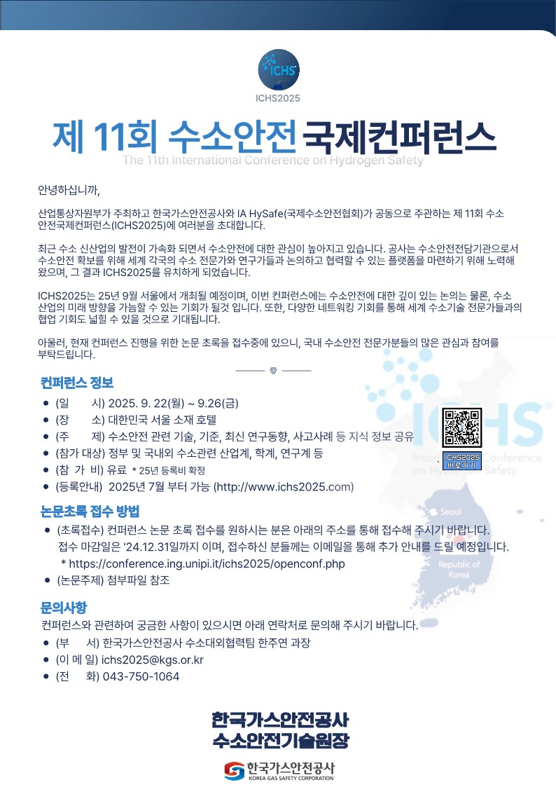 제11회 수소안전 국제컨퍼런스(ICHS2025) 개최 안내