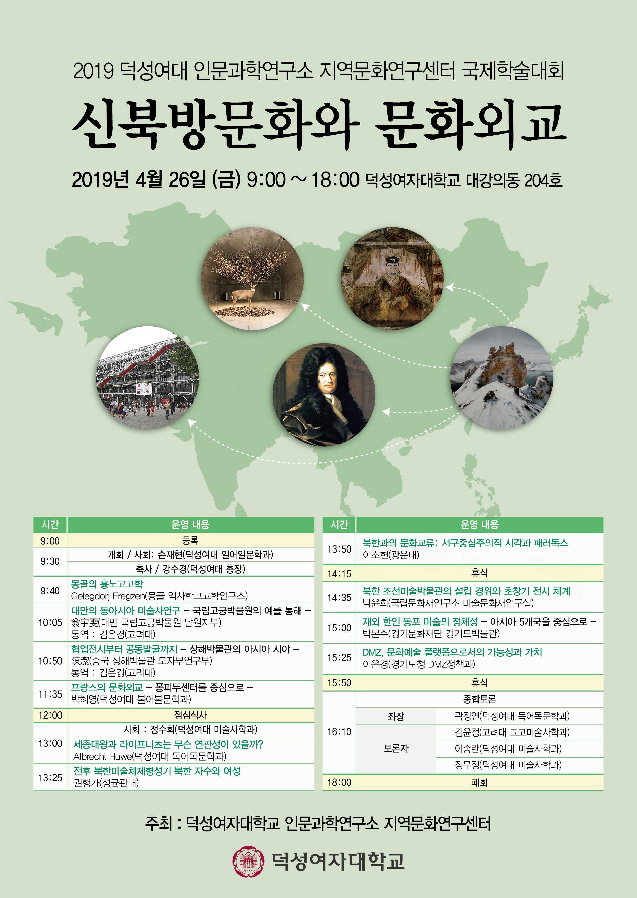 덕성여자대학교 인문과학연구소 지역문화연구센터에서는 2019년 춘계 국제학술대회에 여러분을 초대하고자 합니다. 이번 학술대회에서는 한국, 몽골, 독일, 중국, 대만 등 국내외 여러 학자들이 신북방문화와 문화외교라는 주제를 가지고 오늘날의 신북방문화가 갖는 의미와 그에 상응하는 문화외교의 방향에 대하여 발표와 토론을 진행할 예정입니다. 덕성여자대학교 인문과학연구소는 이번 학술대회를 계기로 남북 협력과 화해를 위한 연구와 교육에 지속적인 관심을 기울이고자 합니다. 바쁘시더라도 함께 하셔서 자리를 빛내주시기 바랍니다.