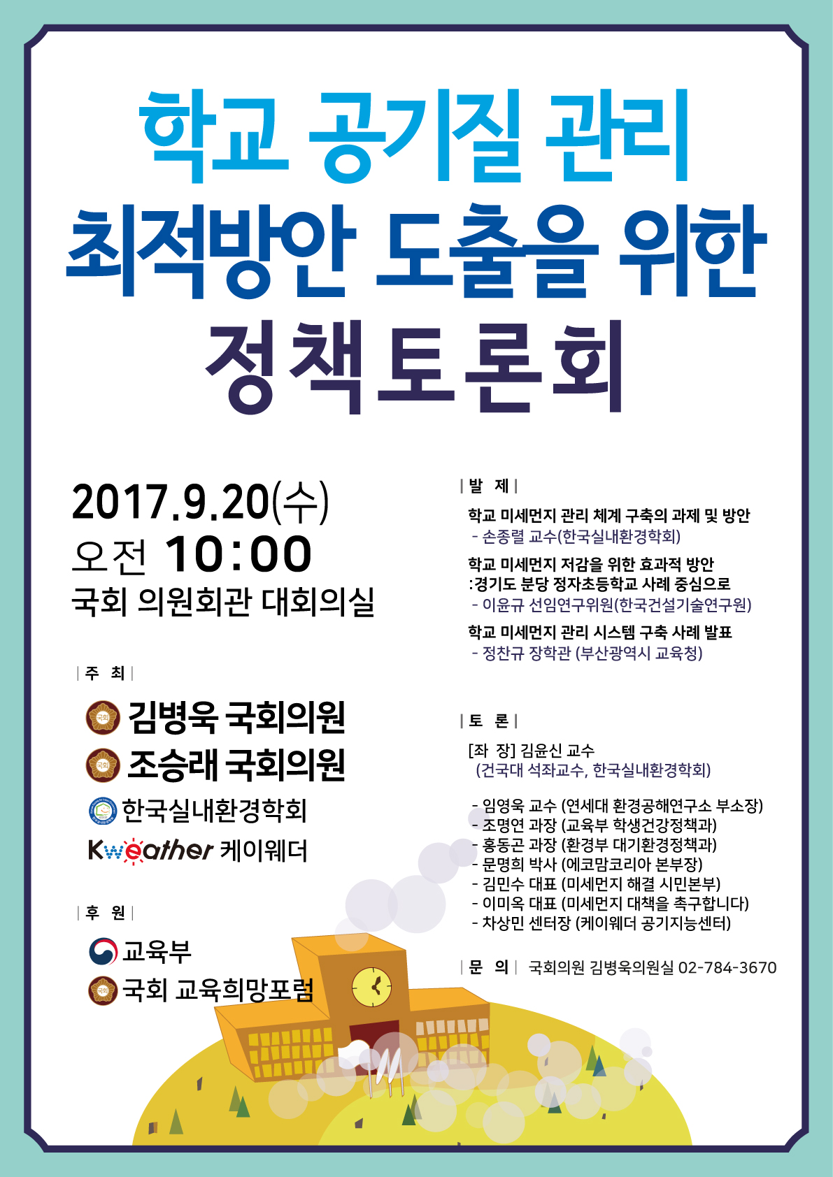 지난 7월 22일 국회에서 초등학교 공기정화장치 설치 시범사업에 추가경정예산 90억원이 편성되었습니다. 사업 시행에 앞서 담당 공직자, 전문가, 시민단체 구성원이 모여 교내 미세먼지를 체계적으로 관리하고, 정부 예산을 효과적으로 사용할 수 있는 방안을 모색해보고자 합니다.