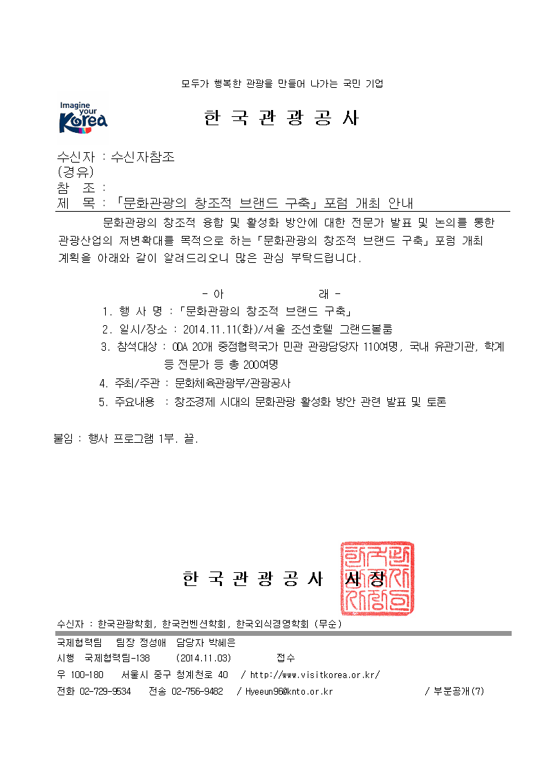 전달]한국관광공사 문화광광의 창조적 브랜드 구축 포럼개최 안내