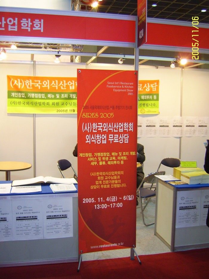 SIRES 2005에서 (사)한국외식산업학회의 무료 창업 상담에 관한 안내 표시입니다.