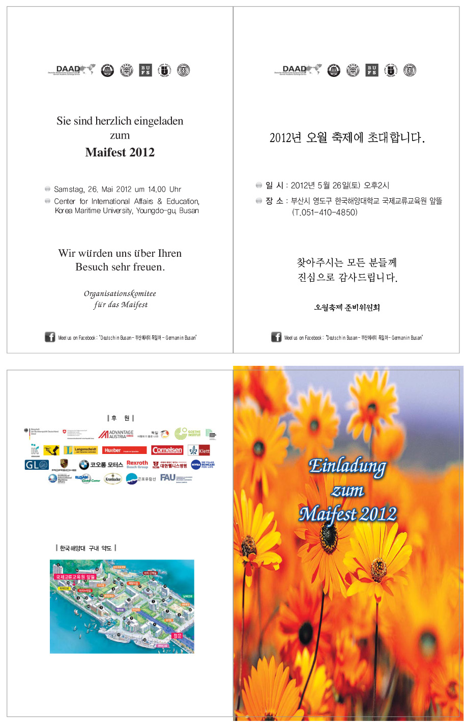 독일 음식과 맥주 등 풍성한 먹거리 및 문화체험과 함께 부산시내 독일관련 학과 학생들의 다양한 공연 및 게임, 경품추첨 등이 준비되어 있으니 싱그러운 5월 독일의 향기에 매료되고 싶으신 분들은 많은 참석 부탁드립니다. 자세한 장소 및 일정은 첨부해드리는 초대장을 참조하시기 바랍니다.