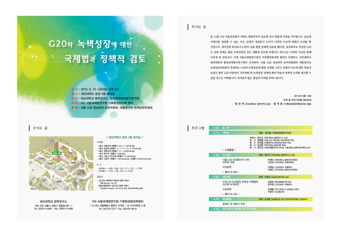 올 11월 G20 서울정상회의 개최는 대한민국이 글로벌 질서 창출에 진입을 의미합니다. 글로벌 어젠다를 결정할 수 있는 주요 20개국 정상들이 모여서 다양한 이슈에 대해서 논의를 할 것입니다. 재무장관 회의로서 G20이 금융 관련 문제에 집중을 했다면, 정상회의로 격상된 G20은 금융 문제는 물론 녹색성장과 같은 새롭게 글로벌 어젠다로 떠오르는 다양한 이슈를 함께 다루게 될 것입니다. 이에 G20와 녹색성장에 관한 국제법 그리고 정책적 이슈에 대한 학술적 토론은 향후 G20 차원에서 기후변화 및 녹색성장 정책에 관한 학술적˙정책적 논의를 제고할 수 있을 것으로 기대합니다. 여러분의 많은 관심과 격려를 부탁드립니다.