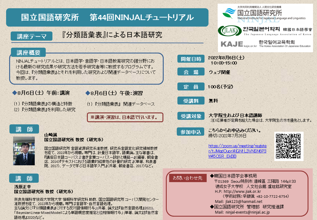 この度、日本国立国語研究所では、韓国日本語学会・韓国日語教育学会と共同で、以下のように、第44NINJALチュートリアルを開催します。