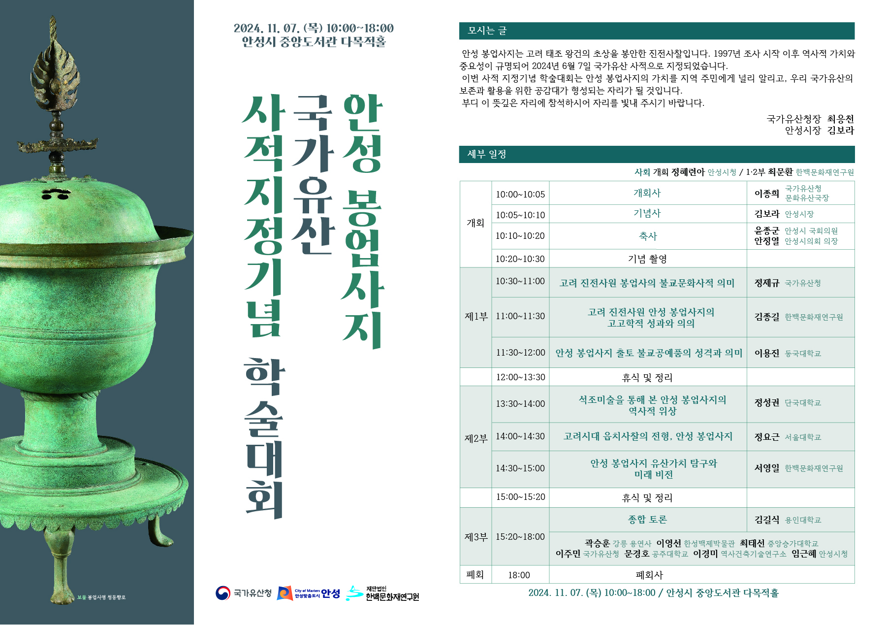 이번 사적 지정기념 학술대회는 안성 봉업사지의 가치를 지역 주민에게 널리 알리고, 우리 국가유산의 보존과 활용을 위한 공감대가 형성되는 자리가 될 것 입니다.