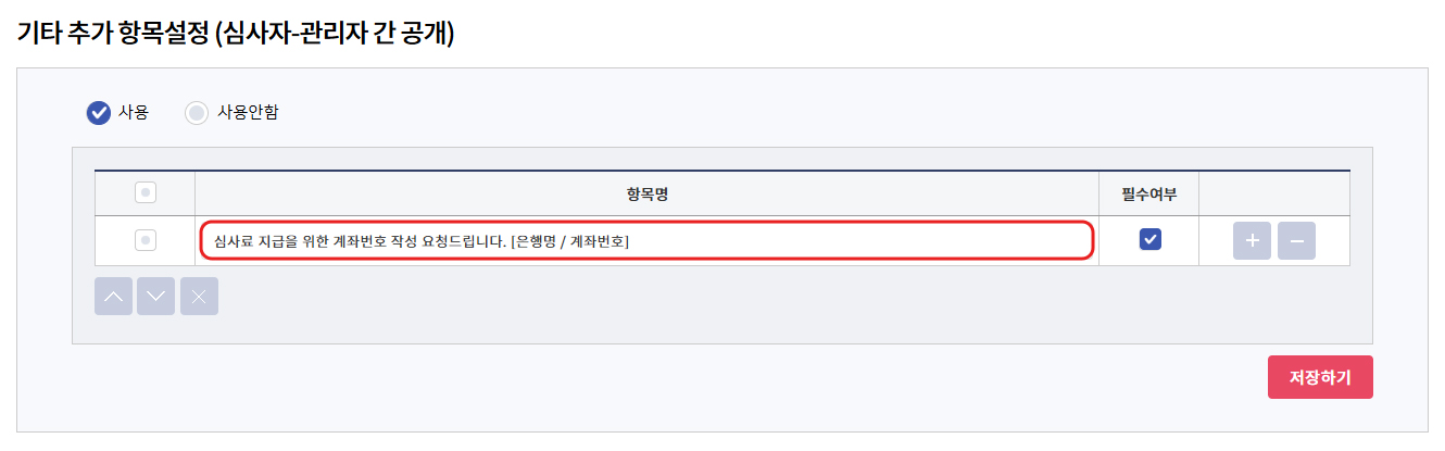심사비 지급을 위한 계좌번호 등은 기타 추가 항목을 활용합니다.