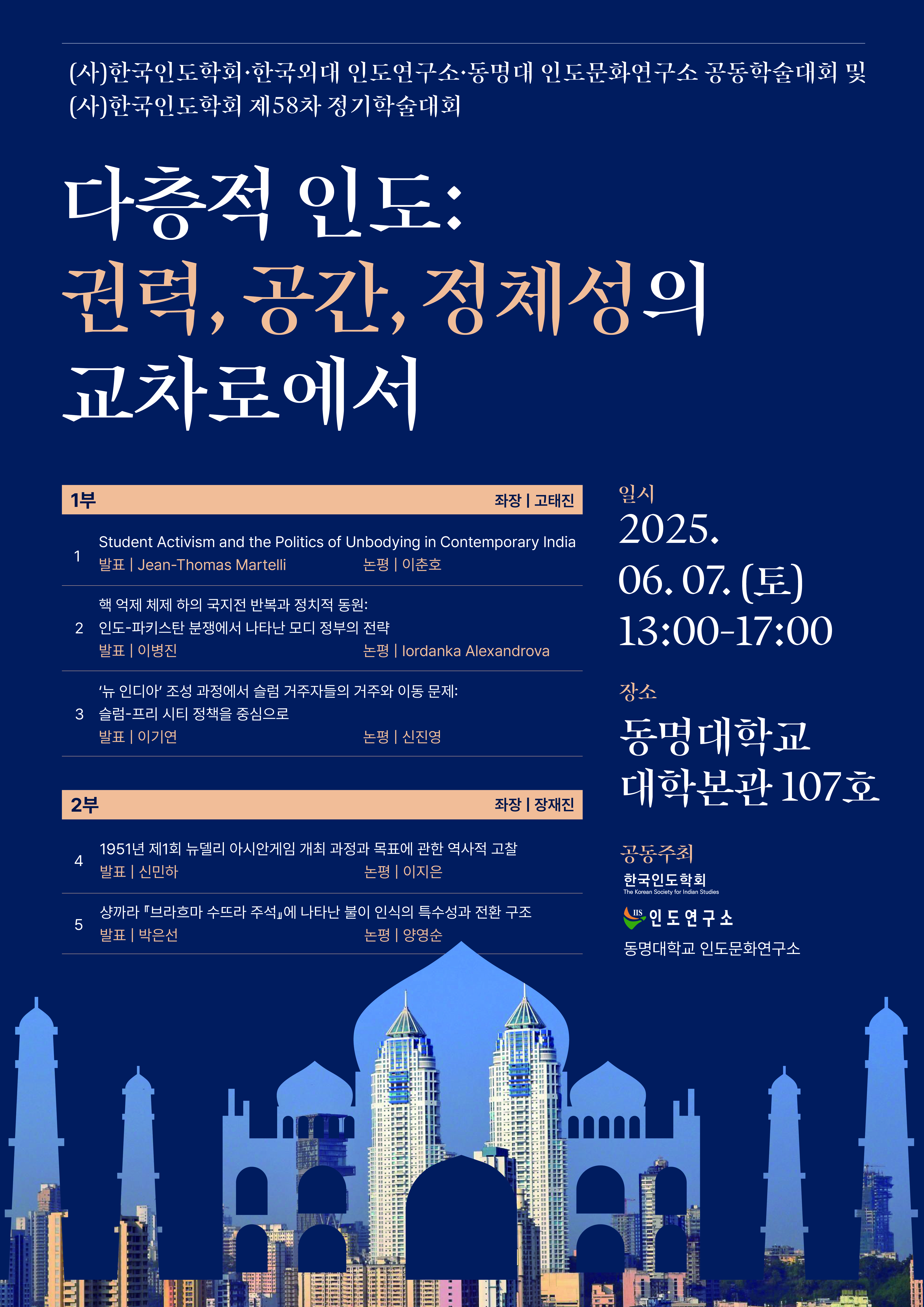 2025년 6월 7일 토요일 동명대학교에서 “다층적 인도: 권력, 공간, 정체성의 교차로에서”라는 주제로 개최되는 이번 학술대회는 인도의 복합적 지형에서 권력관계가 어떻게 형성되고, 물리적·상징적 공간이 어떠한 의미를 가지며, 정체성이 어떻게 교차하고 재구성되는지를 다층적으로 살펴보는 뜻깊은 자리가 될 것입니다. 참석해 주시는 각 분야의 연구자 여러분께서 심도 있는 논의를 통해 인도학 연구의 지평을 한층 확장해 주시리라 기대합니다.