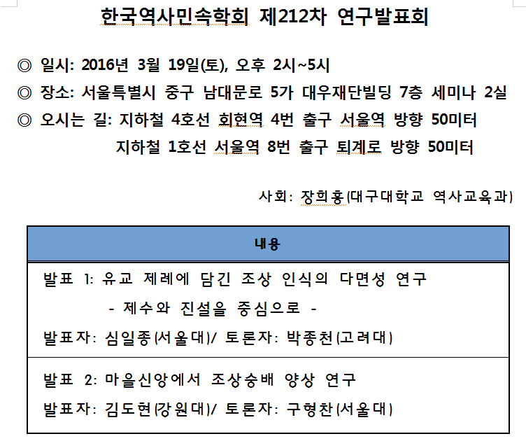 한국역사민속학회 제 211차 연구발표회 및 총회 안내