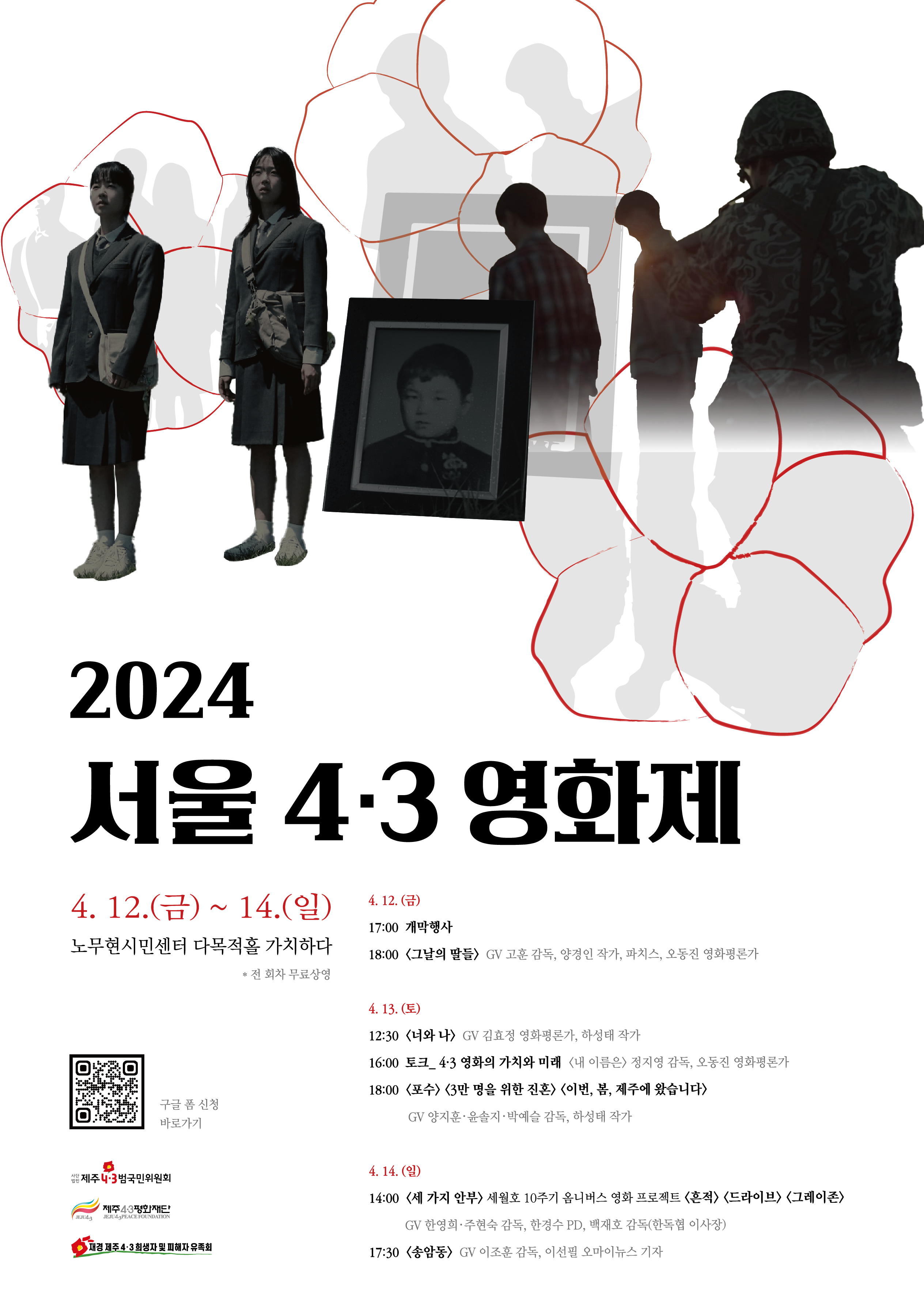 '2024 서울 4.3 영화제'에 초대합니다! 4.3 76주년 서울 기념행사의 일환으로 오는 412()부터 14()까지 노무현시민센터 다목적홀 가치하다에서 2024 서울 4.3 영화제를 개최합니다. 전 회차 무료 상영이고, 구글 폼에서 신청 가능합니다.