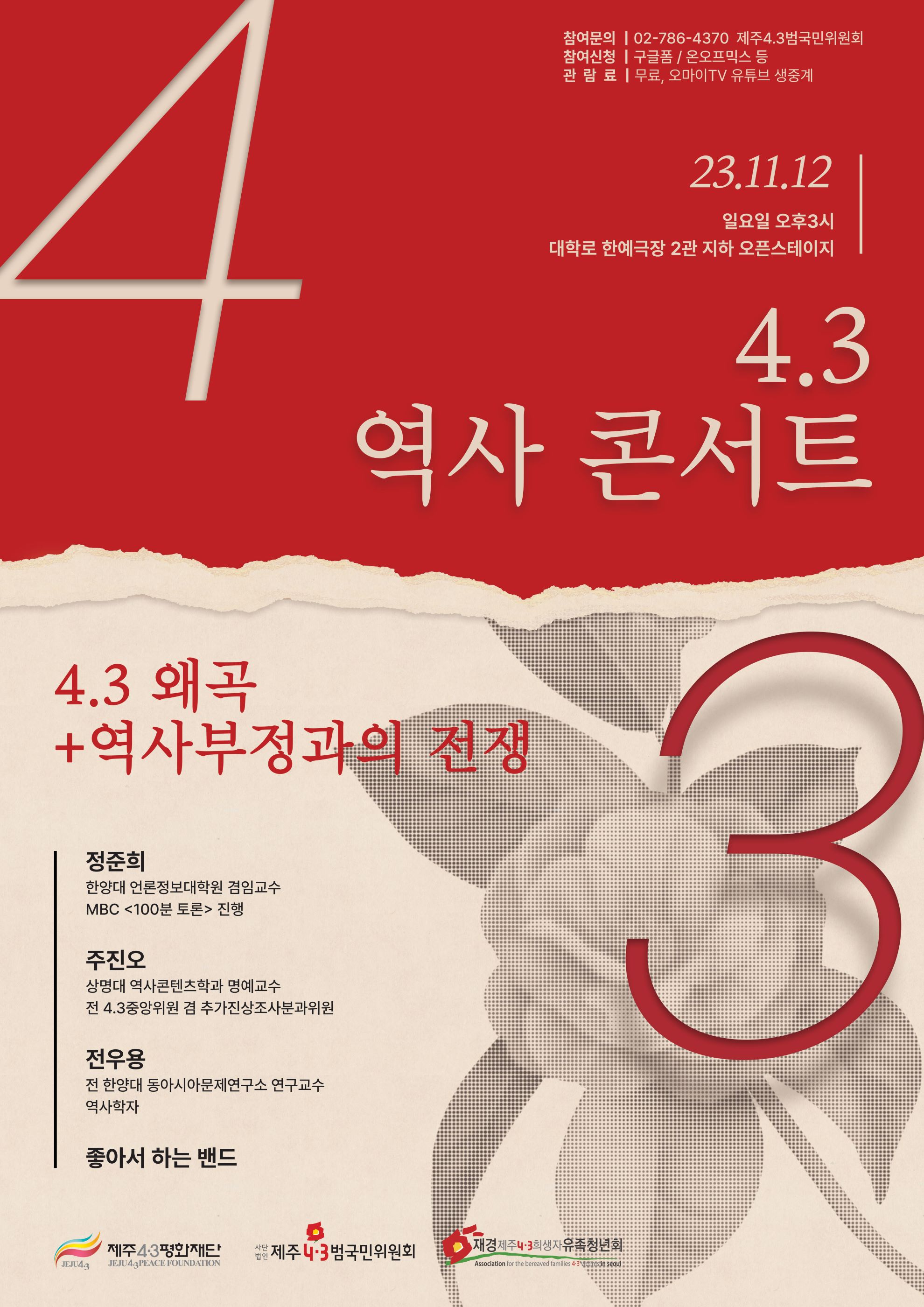 ‘4.3 역사 콘서트 - 4.3 왜곡 + 역사부정과의 전쟁'은 이러한 역사부정과 관련된 현안과 맥락 등을 짚어 내고, 미디어 리터러시 등을 함께 고민할 수 있는 정준희·주진오·전우용 교수, 좋아서 하는 밴드, 양소희 4.3 청년 유족(소셜 기획자) 등과 함께하며, 참가비는 선착순 무료입니다. 참석을 원하시는 분은 아래 신청 폼을 작성해 주세요. 여러분들의 많은 관심과 참여, 공유 부탁 드립니다!