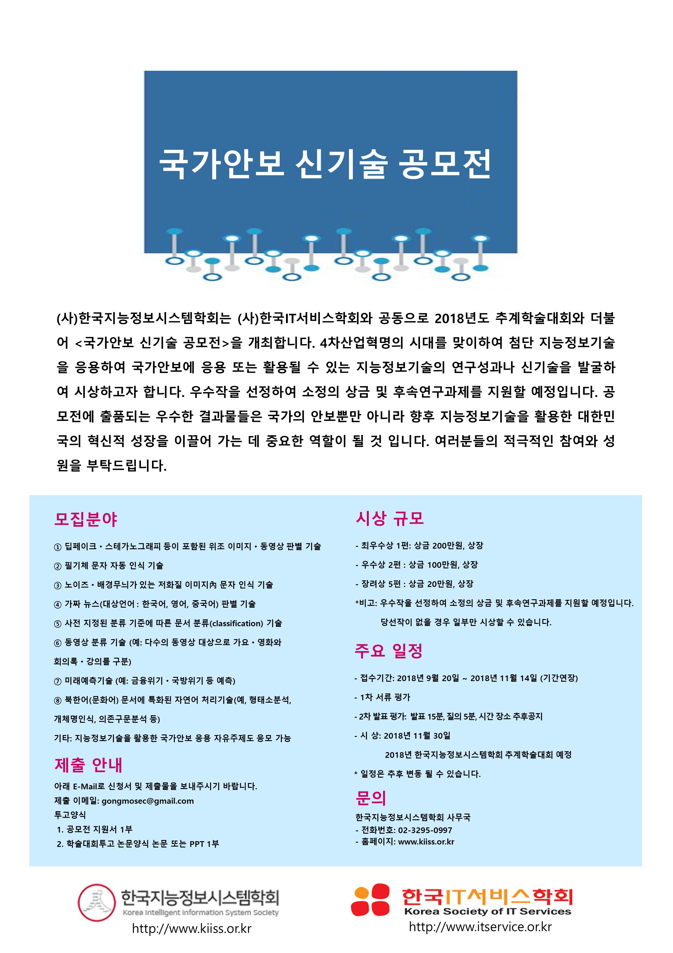 ()한국지능정보시스템학회는 ()한국IT서비스학회와 공동으로 2018년도 추계학술대회와 더불어 <국가안보 신기술 공모전>을 개최합니다. 4차산업혁명의 시대를 맞이하여 첨단 지능정보기술을 응용하여 국가안보에 응용 또는 활용될 수 있는 지능정보기술의 연구성과나 신기술을 발굴하여 시상하고자 합니다. 우수작을 선정하여 소정의 상금 및 후속연구과제를 지원할 예정입니다. 공모전에 출품되는 우수한 결과물들은 국가의 안보뿐만 아니라 향후 지능정보기술을 활용한 대한민국의 혁신적 성장을 이끌어 가는 데 중요한 역할이 될 것 입니다. 여러분들의 적극적인 참여와 성원을 부탁드립니다.