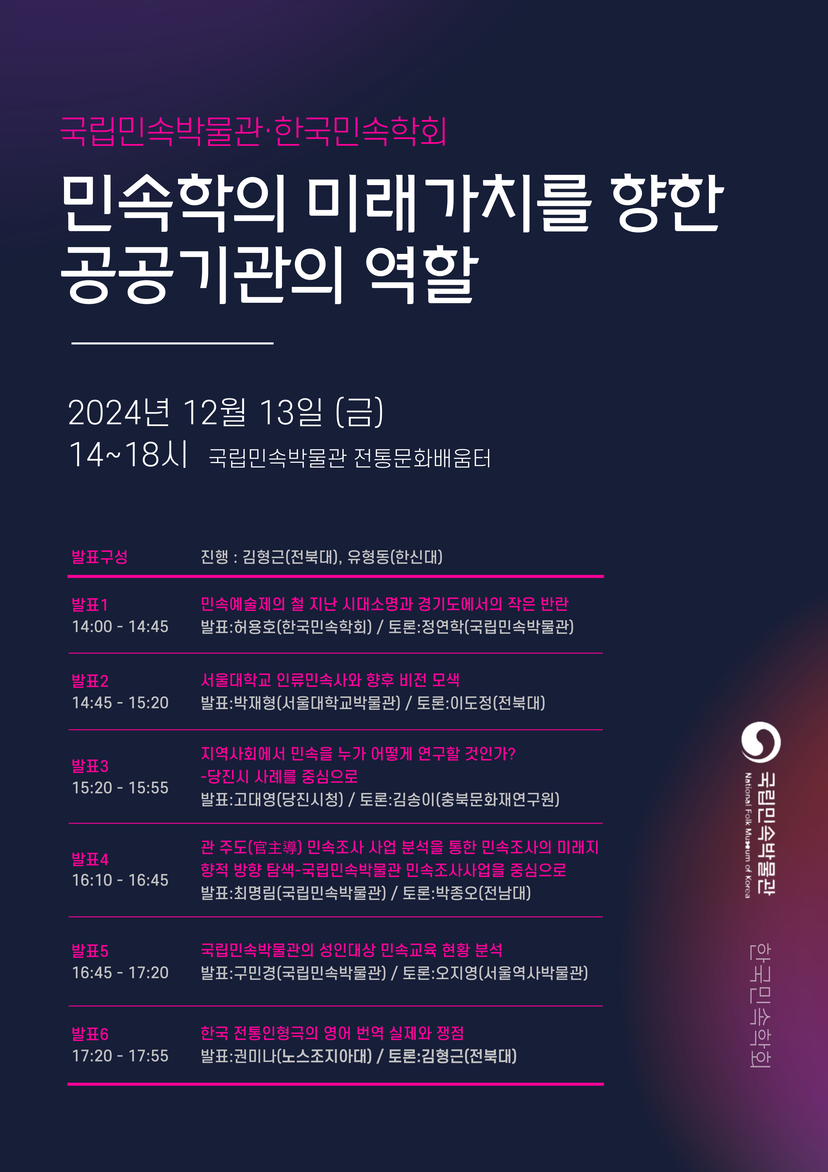 한국민속학회와 국립민속박물관에서는 ‘민속학의 미래가치를 향한  공공기관의 역할’을 주제로 공동학술대회를 갖고자 합니다.