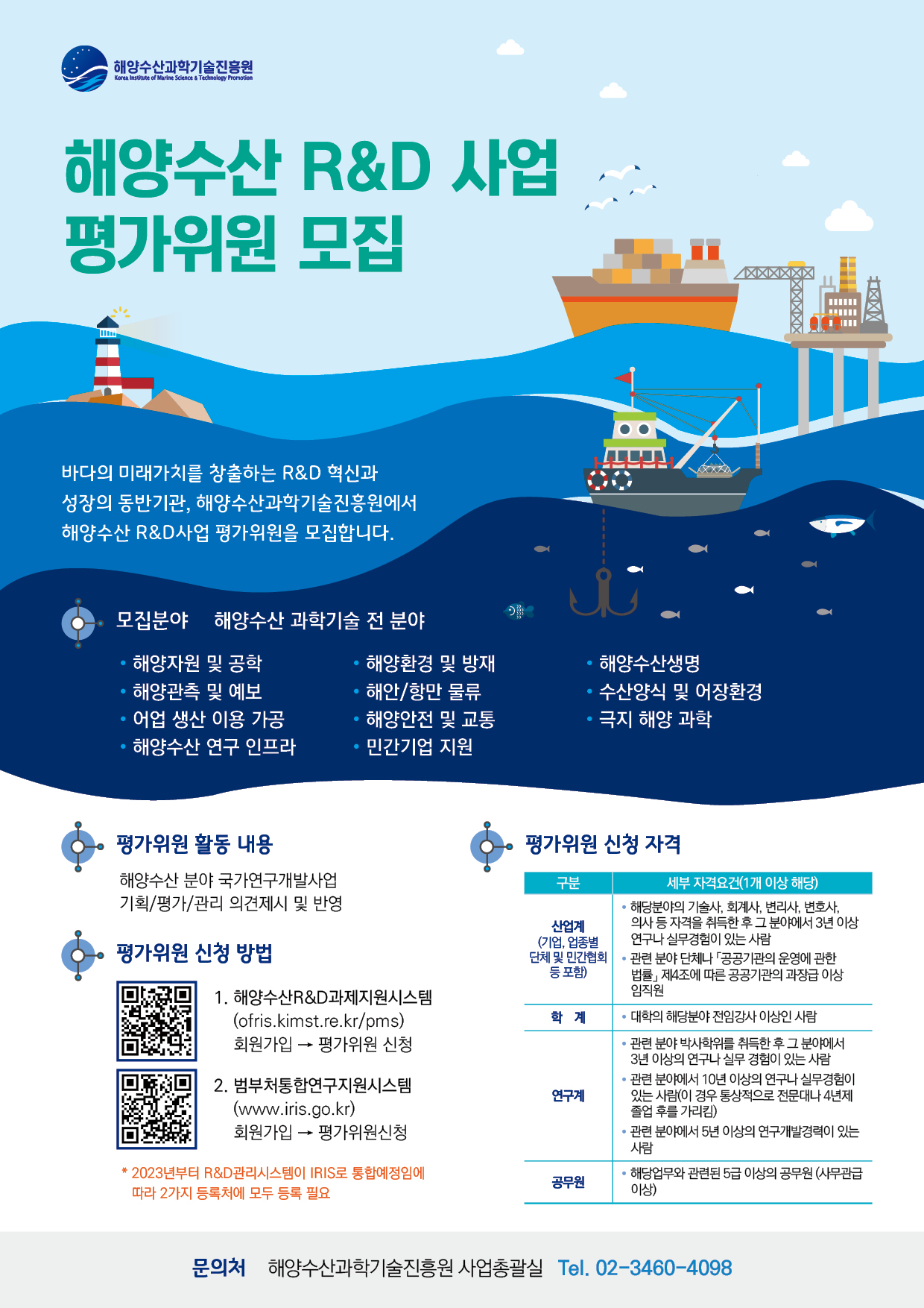 바다의 미래가치를 창출하는 R&D 혁신과 성장의 동반기관 해양수산과학기술진흥원(KIMST)에서 해양수산 R&D 사업 평가위원을 모집합니다.
