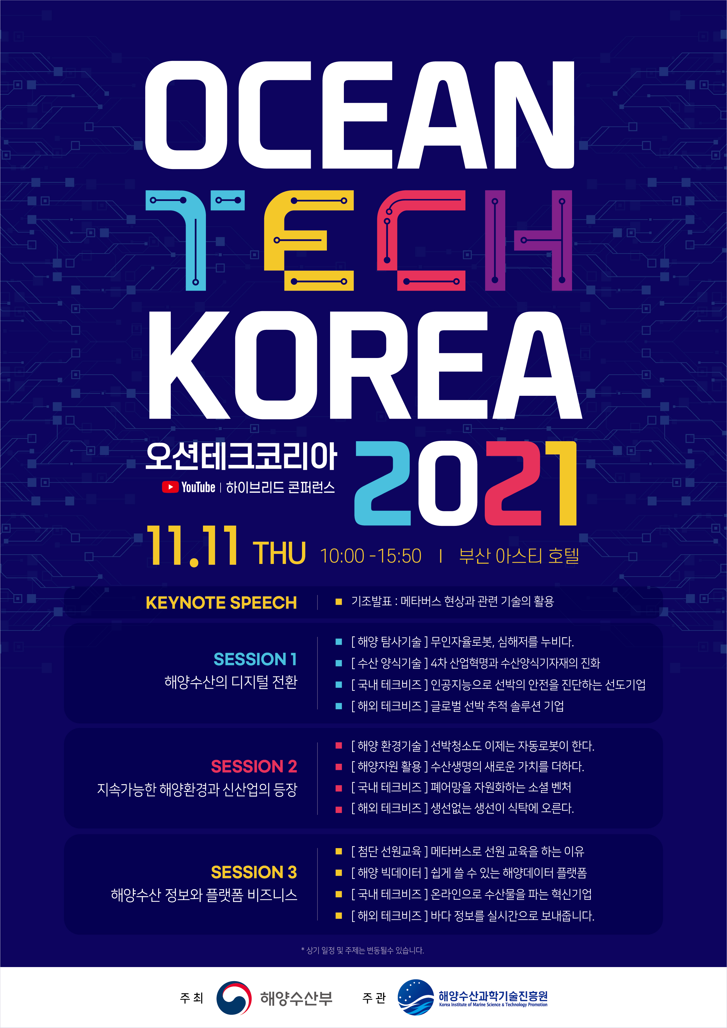본 행사는 세가지 주제의 세션과 기조강연 등 총 13개의 강연으로 구성되어 있으며국내외 연사들과 최신 기술 동향 및 사례를 공유하며 해양 수산과 관련된 혁신 기술 등 좋은 네트워킹의 자리가 될 것으로 생각됩니다